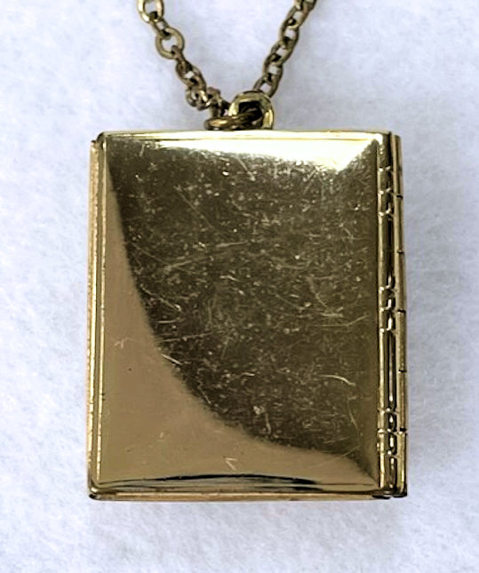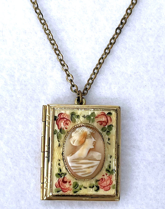 This is a very quaint little vintage locket shaped like a book with a cameo vignette on the front surrounded by buttery yellow enamel guilloche with hand-painted roses. Inside are oval holders for two small photos. The enameling on the front is perfect with no scuffs or scratches visible at all. The back has some very faint scuff marks that show up way more in the photo than in person. All in all, a great piece ready to use with your photos inside. Measures 1" wide x almost 1-1/4" high not counting bail. Chain is 18" long.