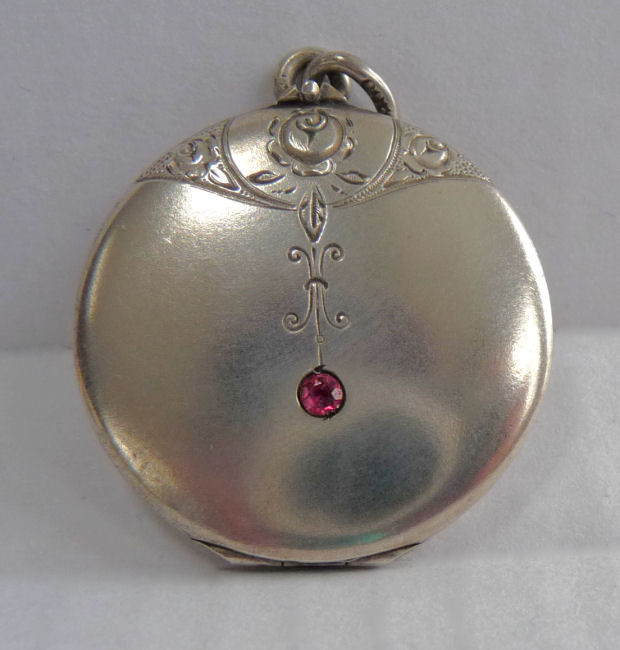 German (800) Silver Art Nouveau Locket with Ruby Jewel and Etched Rose