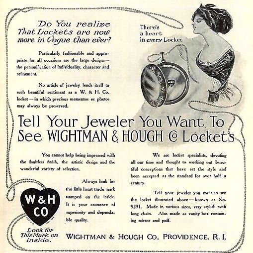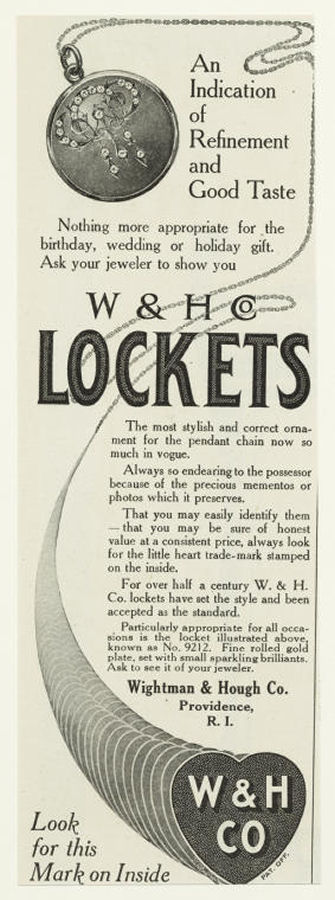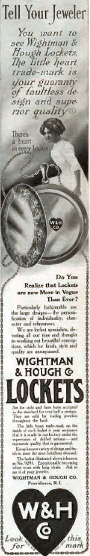 This is a stunning locket made circa 1900 by Wightman & Hough Co. of Providence, Rhode Island. The company was in business from 1856 - 1922 and their slogan was "There's a heart in every locket" which referred to their company logo --W & H Co. in a small heart -- found inside their lockets. All of their lockets were made of quarter gold or fine rolled gold plate. This particular locket has a diagonal design of inset "diamond" stones which they referred to as "brilliants". The interior has both of the original cello inserts and the original chain is a very ornate engraved book link style. The locket is in excellent condition. Be sure to look at all the photos including copies of three original ads which tells more about their jewelry. Locket measures 1-3/16" diameter and the chain is 17" long.