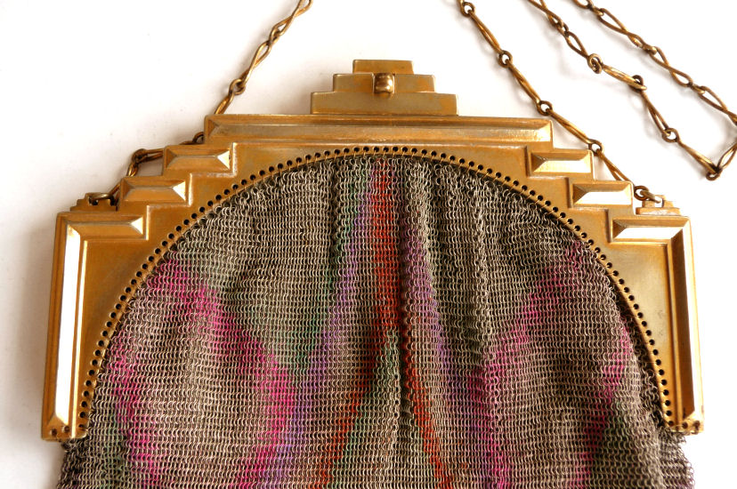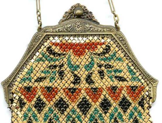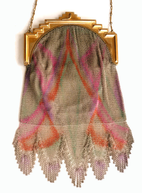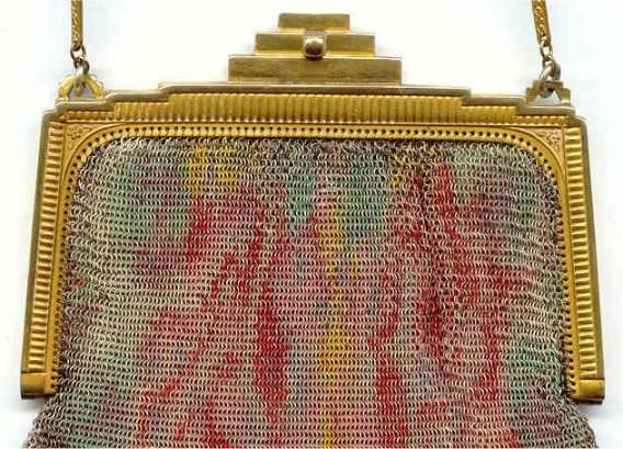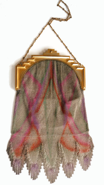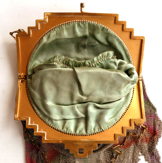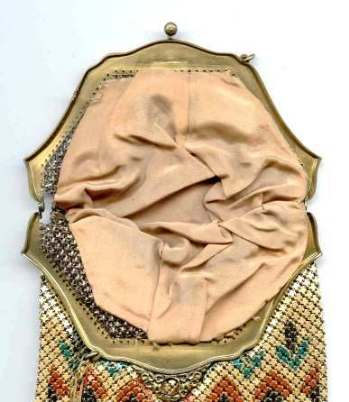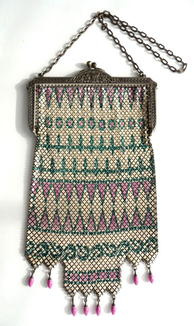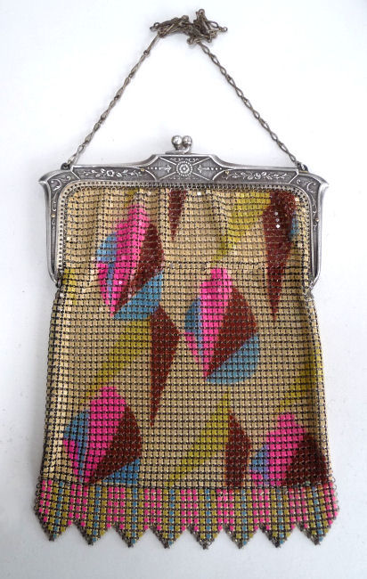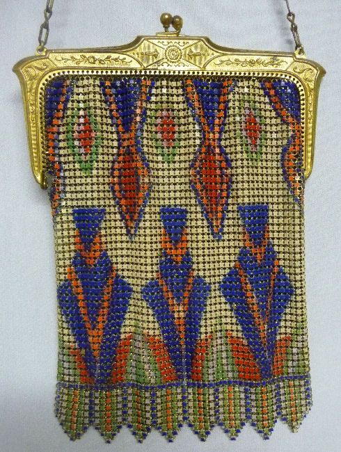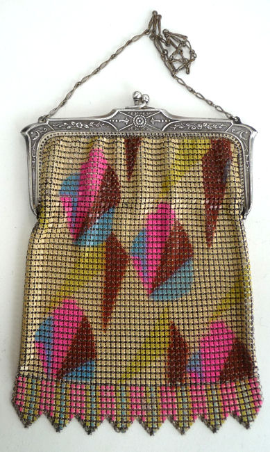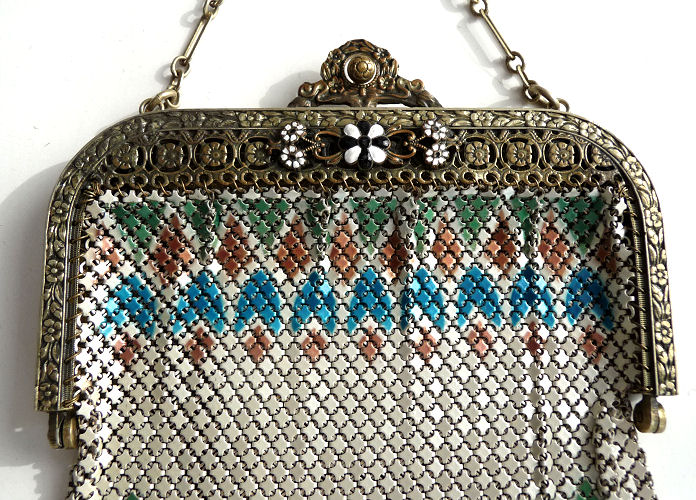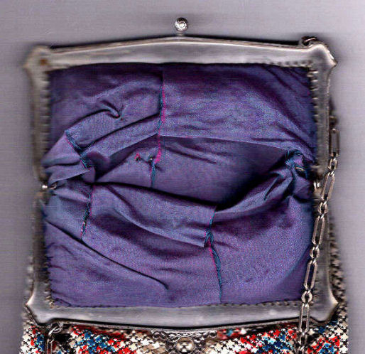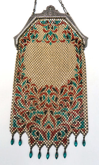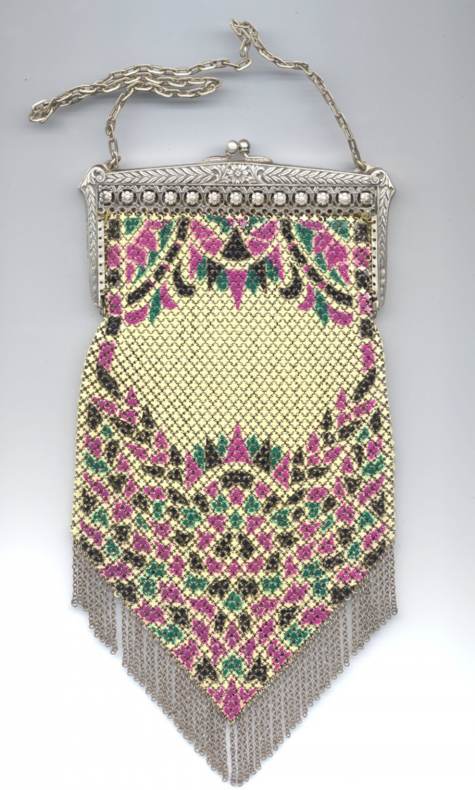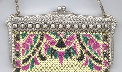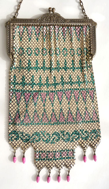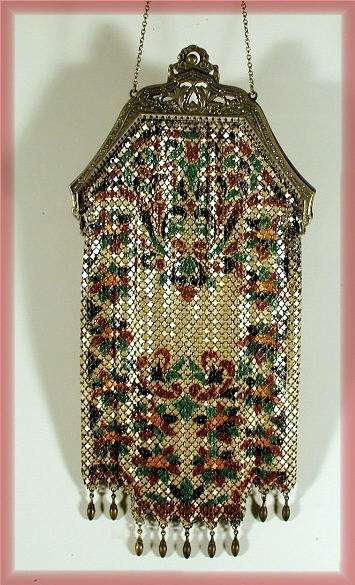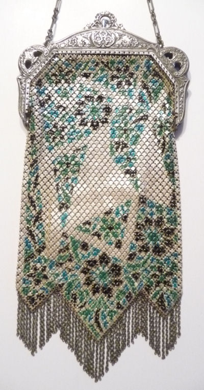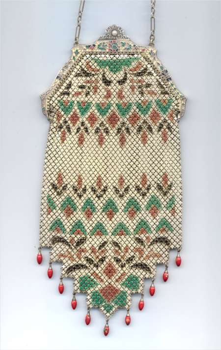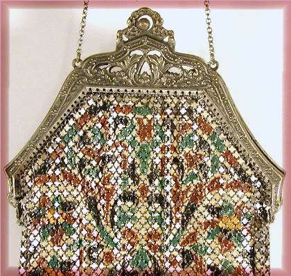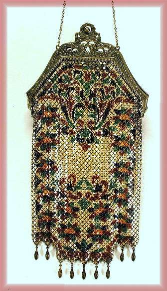 Even though this particular purse is not signed by Whiting & Davis, I have had this identical one in my collection before which was signed W & D so I am going to say that it was manufactured by them. It is stamped soldered mesh however. The design is definitely art deco influenced and it is done in the finest of Dresden mesh in pretty, vibrant colors. You have to look at that fringe ... it is spectacular and very full. There is some very minor wear to the frame but other than that this entire purse is in fabulous condition. Interior is lined in pale green silk also in perfect condition. Measures 5" wide x 9" long from clasp to fringe. First time listed! (Click on pic for more photos.) |