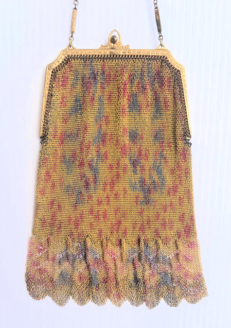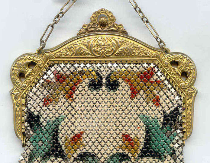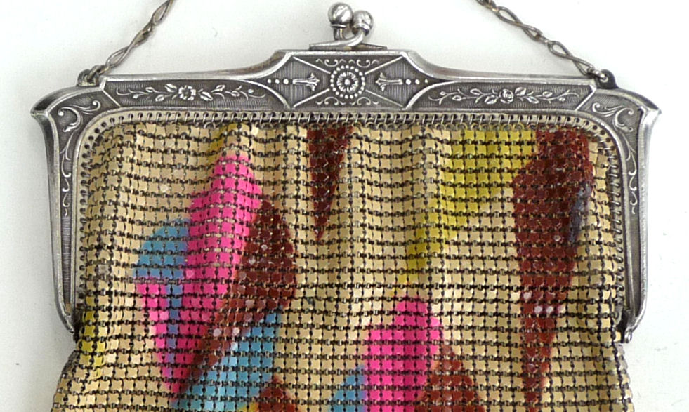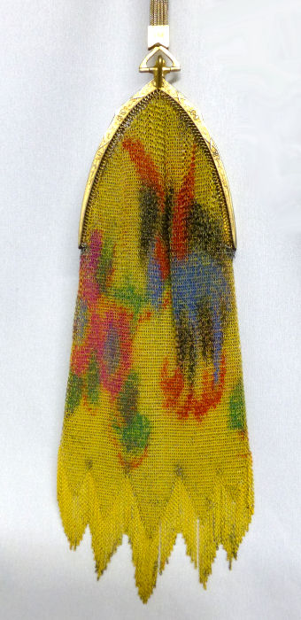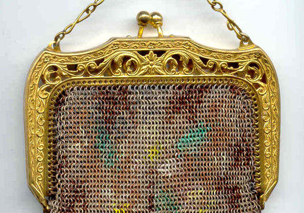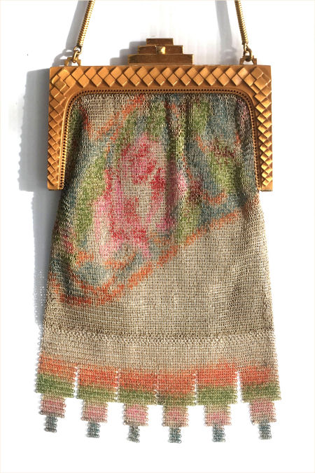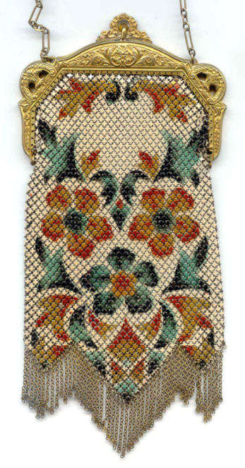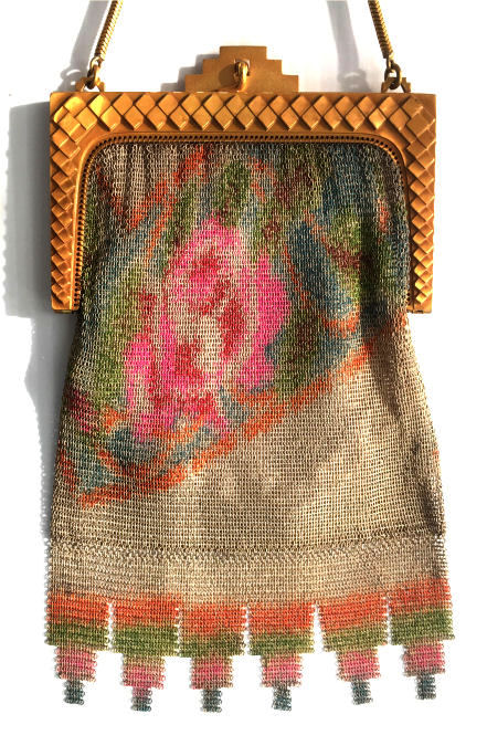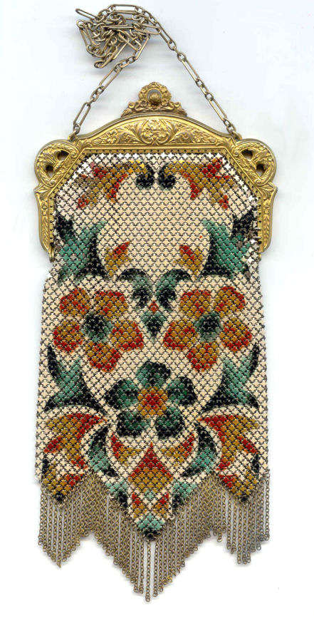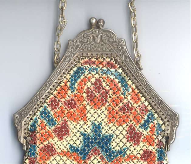 This fine Whiting & Davis Dresden mesh purse has wonderful colors of teal, orange, purple, pink, green, yellow, fuchsia & numerous others in a depiction of roses. The striped effect in the fringe is just magnificent, especially considering that the geometric stepped fringe is rare to find in these purses! Plain shaped gold frame is accented by a bar and link handle with embossed designs on the bars. Interior is lined in pale peach silk with ruched pocket. Lining is torn in a few places and needs some stitches replaced where it joins the frame ... all minor when considering that the important part -- the mesh -- is all perfect. Colors are as bright and vivid as the scan shows ... wow! Measures 4" wide x 7" long to tip of fringe. Previously listed for $675. (Click on pic for more photos.) |