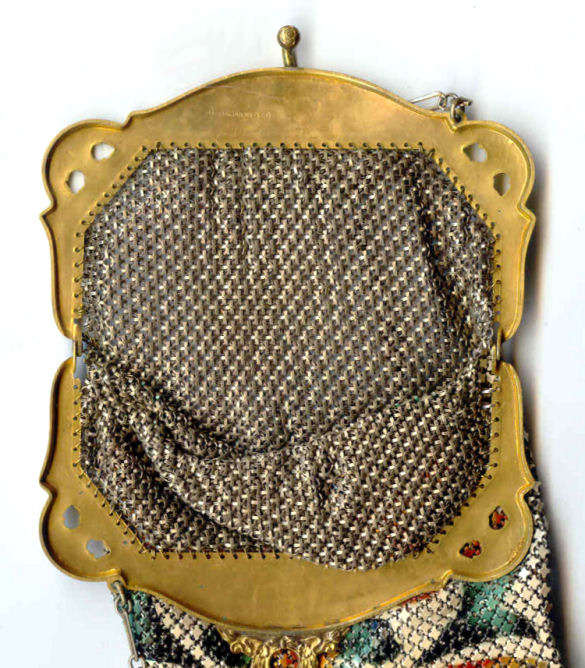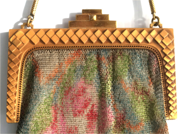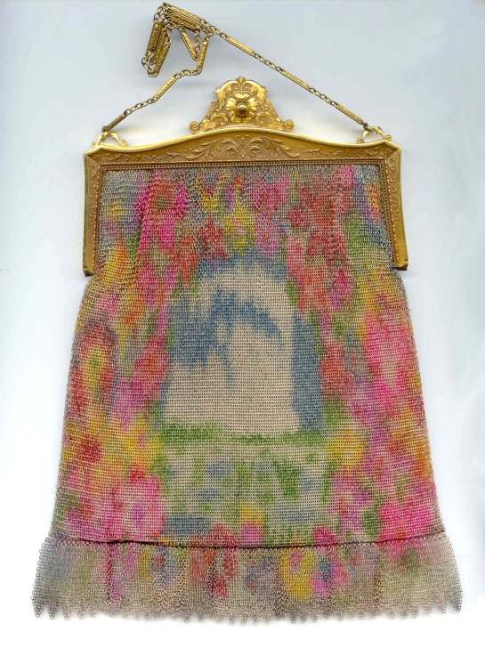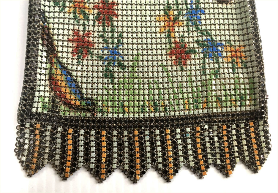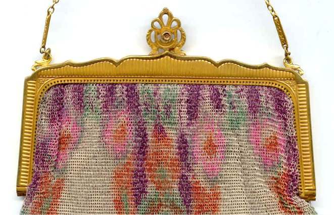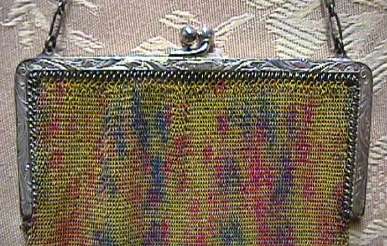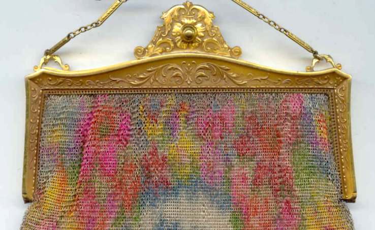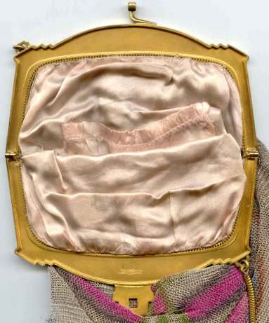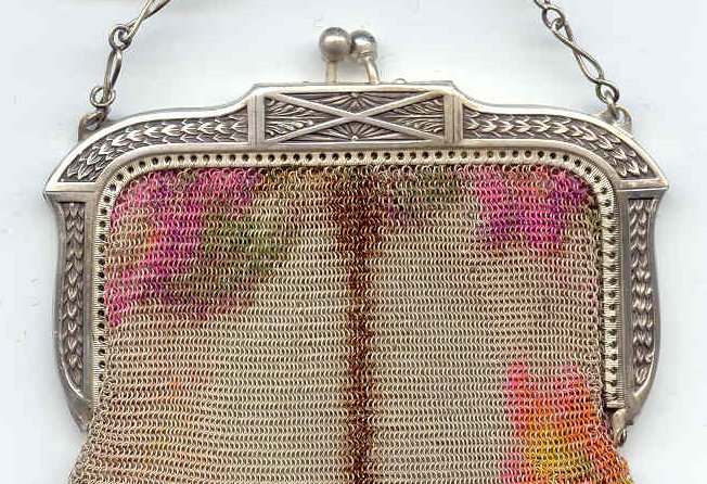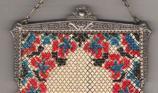 This fine Whiting & Davis Dresden mesh purse has wonderful colors of teal, orange, purple, pink, green, yellow, fuchsia & numerous others in a depiction of roses. The striped effect in the fringe is just magnificent, especially considering that the geometric stepped fringe is rare to find in these purses! Plain shaped gold frame is accented by a bar and link handle with embossed designs on the bars. Interior is lined in pale peach silk with ruched pocket. Lining is torn in a few places and needs some stitches replaced where it joins the frame ... all minor when considering that the important part -- the mesh -- is all perfect. Colors are as bright and vivid as the scan shows ... wow! Measures 4" wide x 7" long to tip of fringe. Previously listed for $675. (Click on pic for more photos.) |