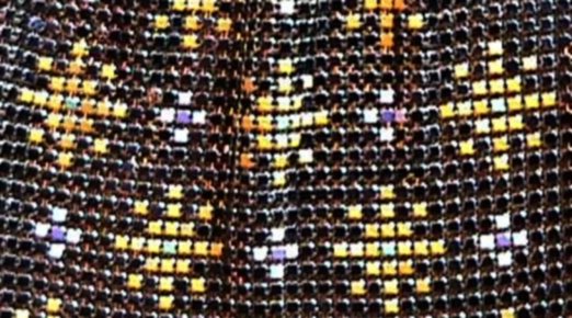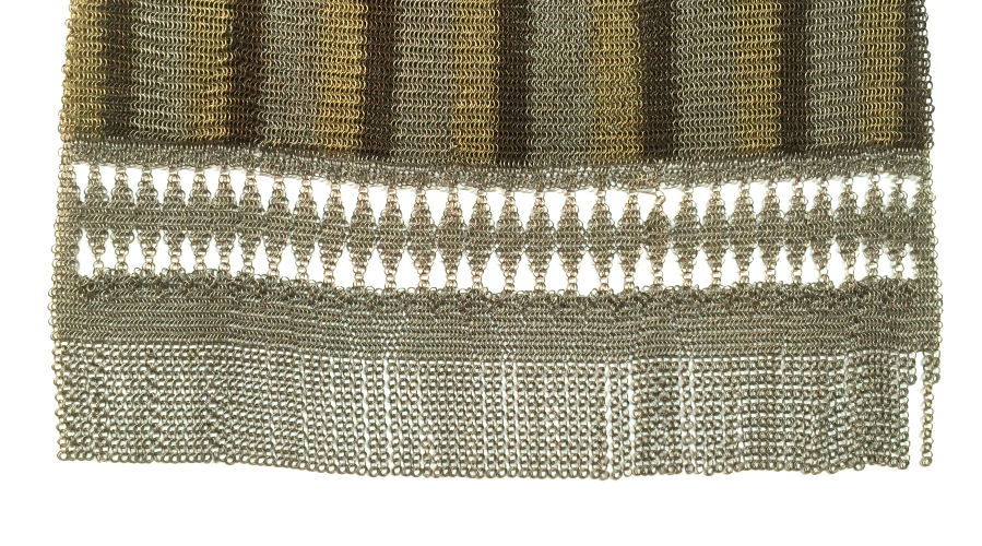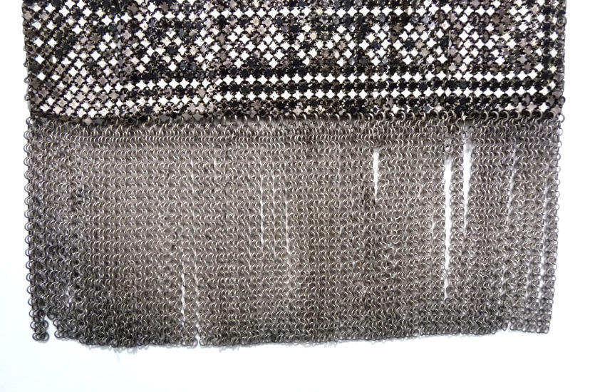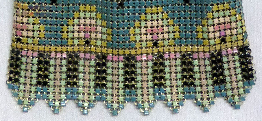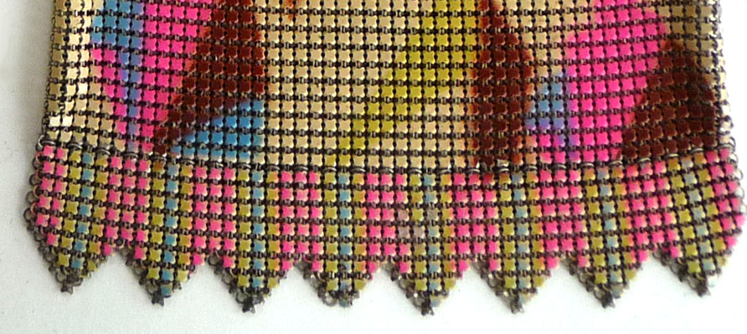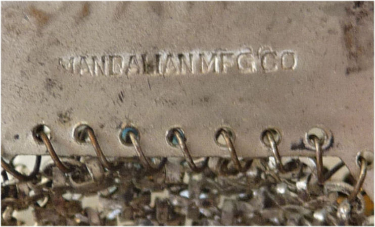 Very hard to come by, this is one of Mandalian's most desirable purses. Known as the "Gloria" bracelet purse, the name comes from the fact that the frame opens like a bracelet on a type of built-in spring. The finger-snapover closure lifts up and back to open. Vibrant colors in excellent shape are identical on both sides. There are some fringe links missing, but it is very hard to determine as they hang so closely together. Overall the purse is in excellent condition with no damage to the mesh other than very minor paint loss on a few tiles near the top corners which blend in to the darker colors around them. Purse measures 4-1/2" wide x 8" long to bottom of fringe. Previously listed for $1,395 .. now selling for below my cost! (Click on pic for more photos.) |