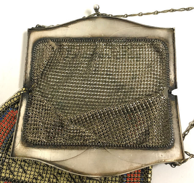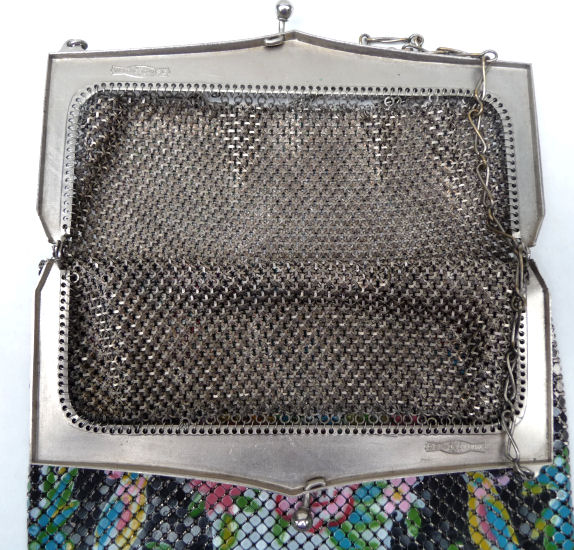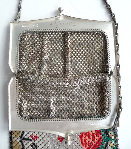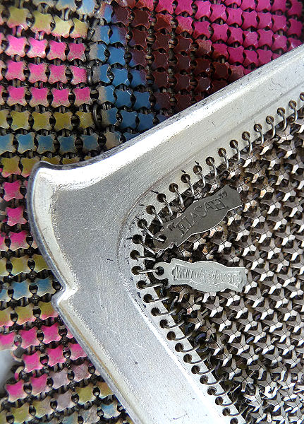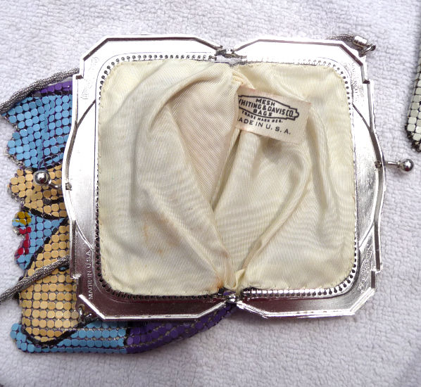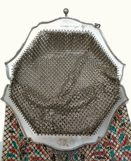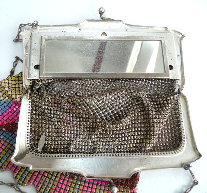 Here again is another very rare mesh purse by Whiting & Davis ... this one has a rigid mirror built into the inside of the frame. I have only seen one or two of these over the years and none exactly like this one. The frame is silver embossed with flowers on both sides and the enamel mesh is a beige color with art deco designs in hot pink, blus, yellow and chocolate brown. The bottom is finished in a Vandyke style fringe in pink, blue, and yellow (the yellow is almost a chartreuse shade ... very pretty). There are two hang tags inside, one for Whiting & Davis and the other stating El-Sah design. Mesh is all tight to the frame and there is only enamel loss on a few of the tiles ... it is mostly perfect. It is a larger than usual W & D purse measuring 5-1/4" wide at the frame x 7" long. First time offered! (Click on pic for more photos.) |