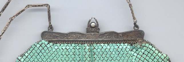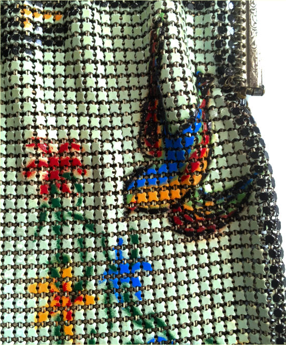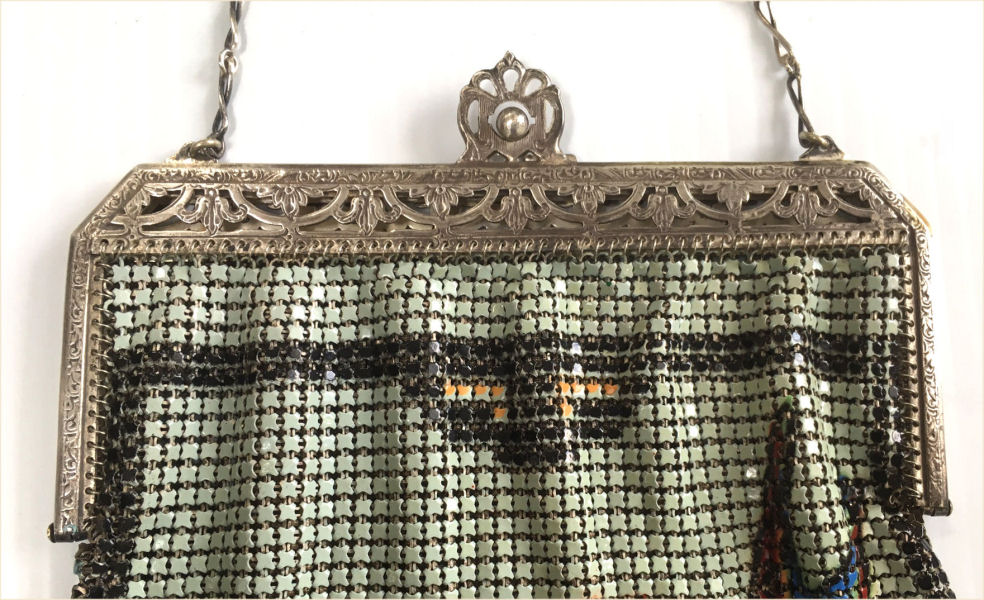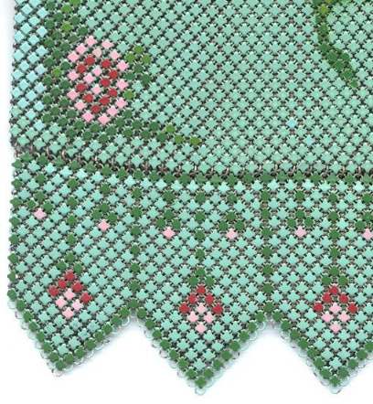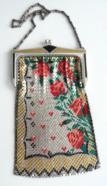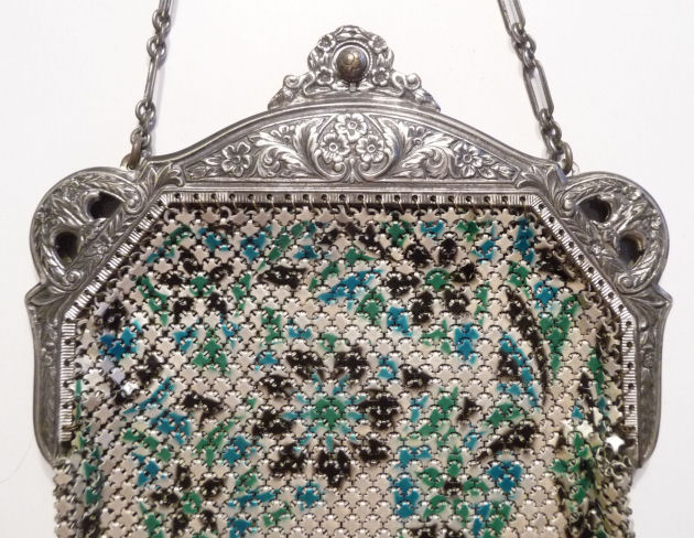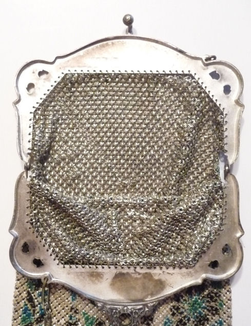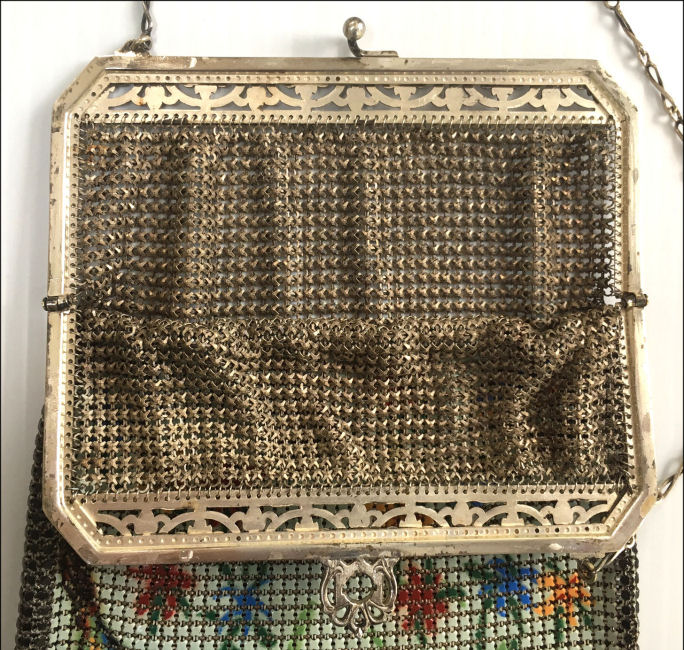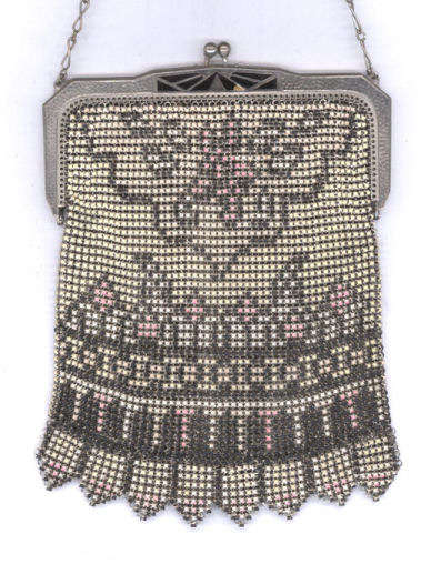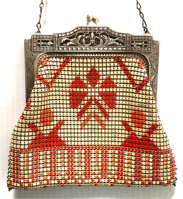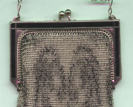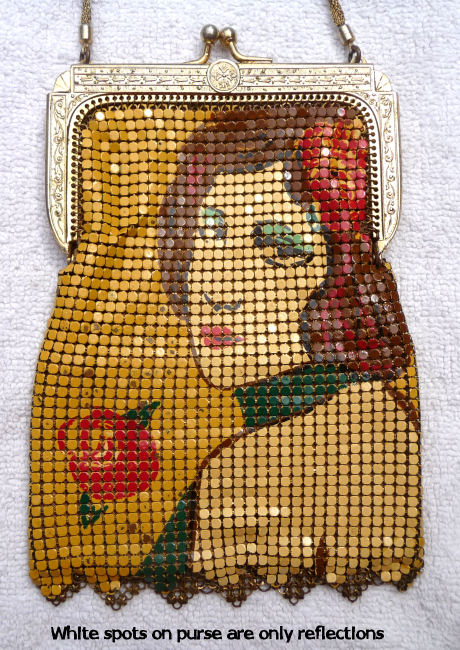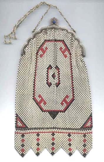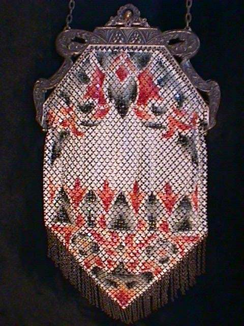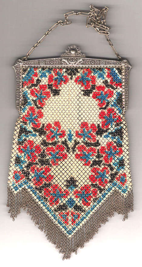 This Mandalian mesh purse has one of the prettiest frames that I have seen. It is quite large and very ornately embossed ... just a knockout! Purse is enameled in snowy white with red, coral, and gray/green fading to almost black at the tips. Interior is lined in original off-white silk and is in very good condition. The enameling is all perfect. There are a few tiles that have become unlinked at each hinge but not detrimental to the purse in any way (visible in pic). There are three chainlink fringes missing and two that are a bit shorter, but these are spaced evenly and not really noticeable. Measures 4-1/2" wide at frame x 9" long to bottom of fringe. Previously listed for $499. (Click on pic for more photos.) |