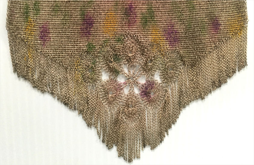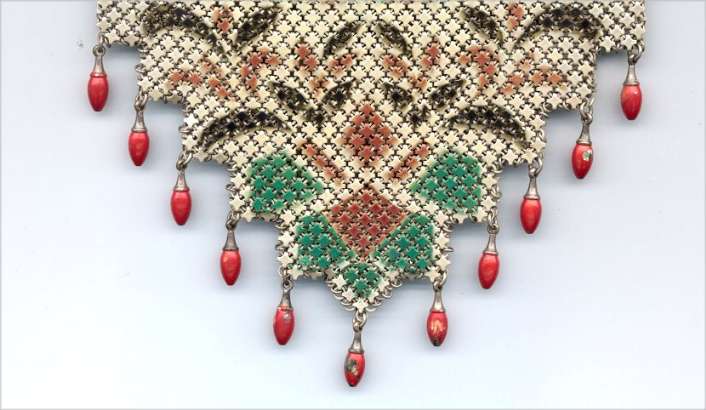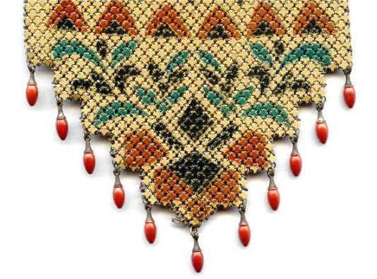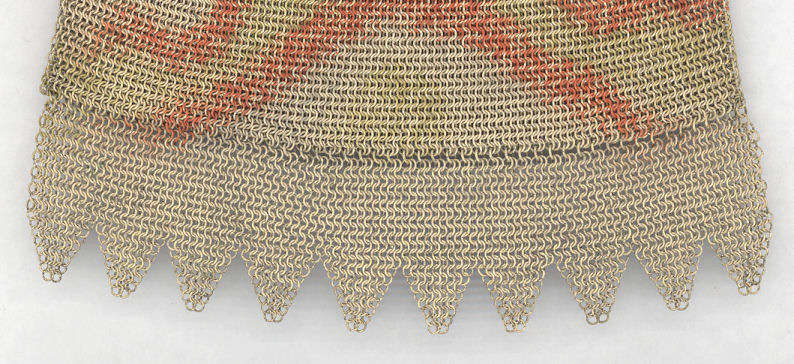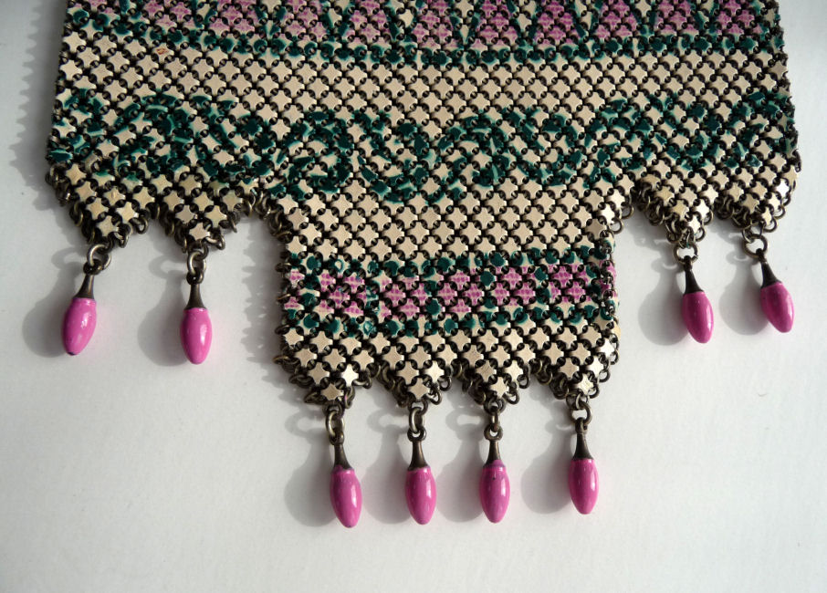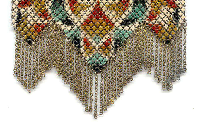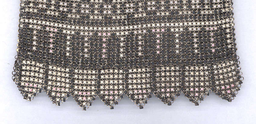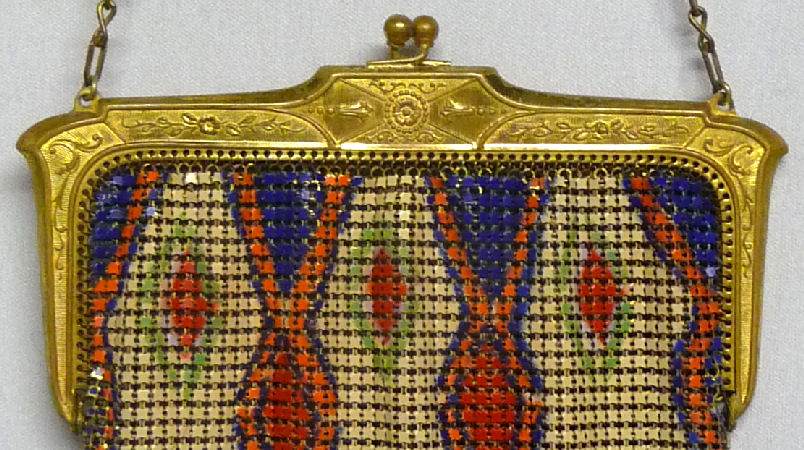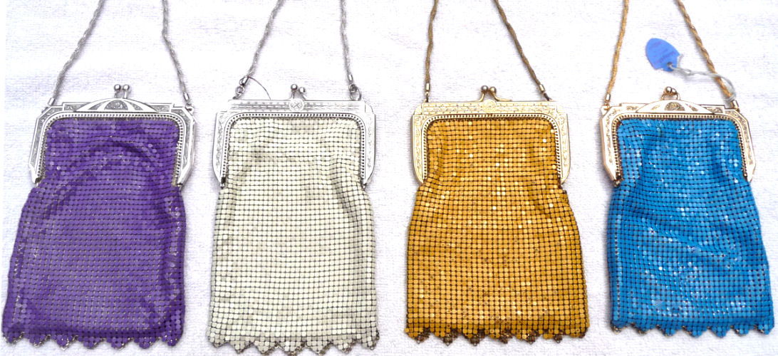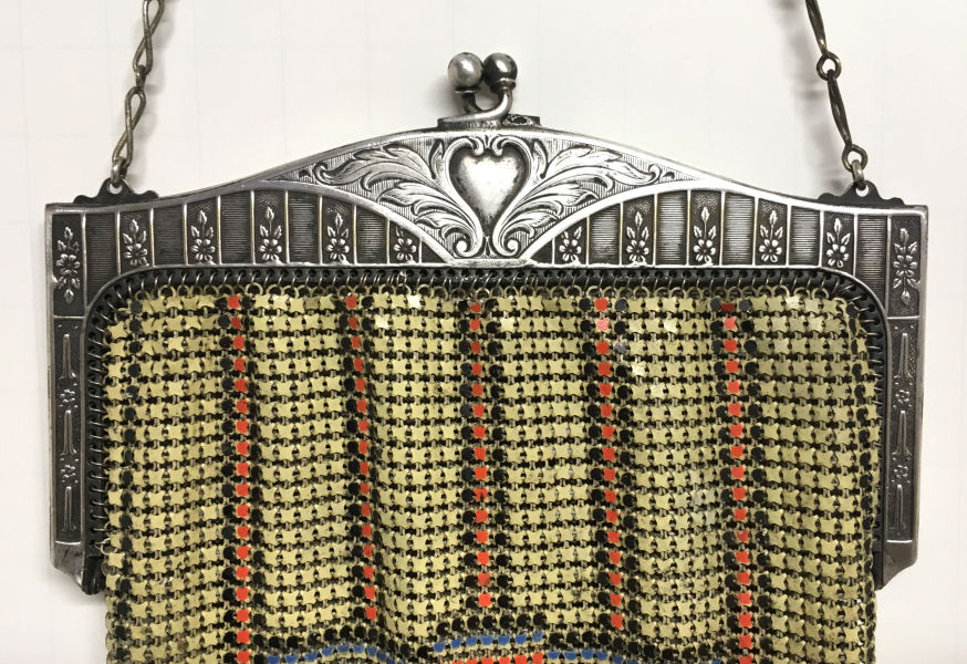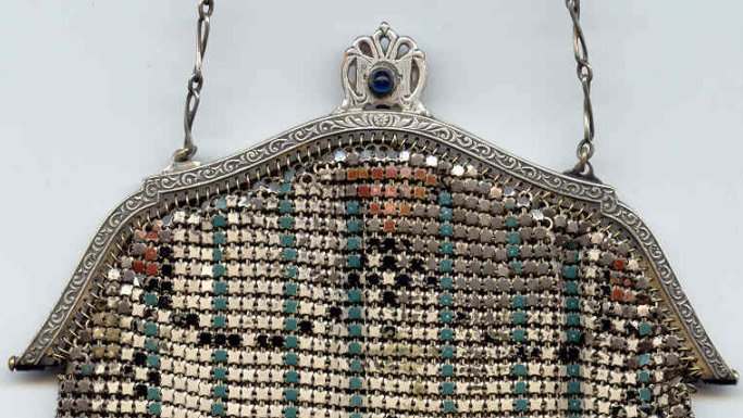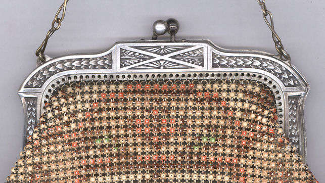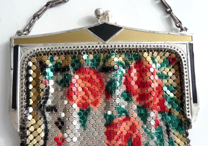 This Mandalian mesh purse has one of the prettiest frames that I have seen. It is quite large and very ornately embossed ... just a knockout! Purse is enameled in snowy white with red, coral, and gray/green fading to almost black at the tips. Interior is lined in original off-white silk and is in very good condition. The enameling is all perfect. There are a few tiles that have become unlinked at each hinge but not detrimental to the purse in any way (visible in pic). There are three chainlink fringes missing and two that are a bit shorter, but these are spaced evenly and not really noticeable. Measures 4-1/2" wide at frame x 9" long to bottom of fringe. Previously listed for $499. (Click on pic for more photos.) |