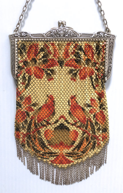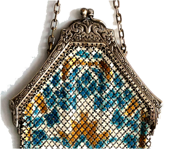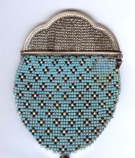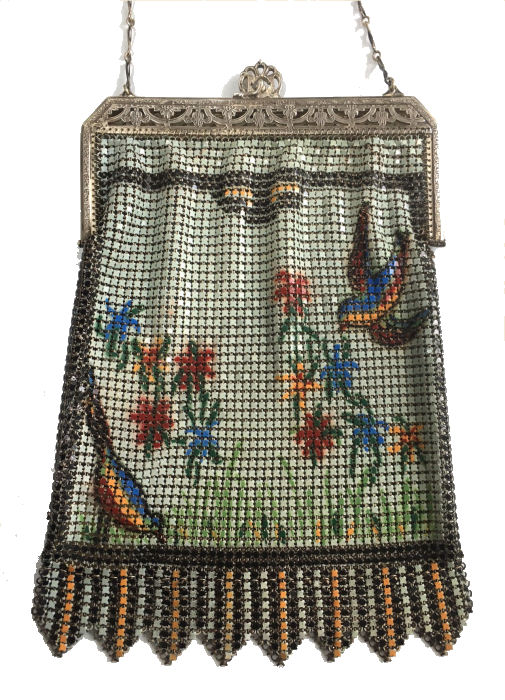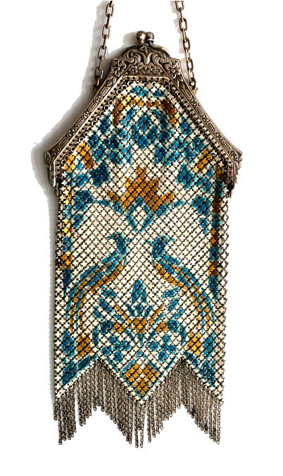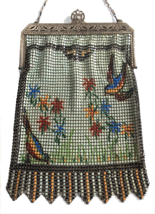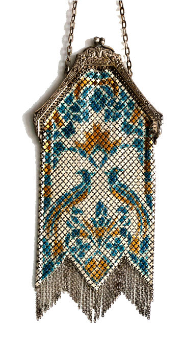 This is a very rare Whiting & Davis mesh purse that has been in my personal collection since 2001. It features two bluebirds and flowers on a light aqua background. There is an art deco striped Van Dyke fringe and a black border around the scene. One of the birds is in full flight while the other is pecking on the ground. The frame is quite beautiful in an openwork design and clasp all in a design I have not seen before. Both sides feature the same scene and the Whiting & Davis logo is stamped on the inside of the frame on the side edge rather than the top. I believe this is one of W & D's earlier designs. There is minimal, if any, wear to the enamel and it is in truly excellent condition for its age which is going on 100 years. It is also a fairly large purse measuring almost 5" wide at the frame x 8 " long from clasp to fringe tip. First time offered. (Click on pic for more photos.) |