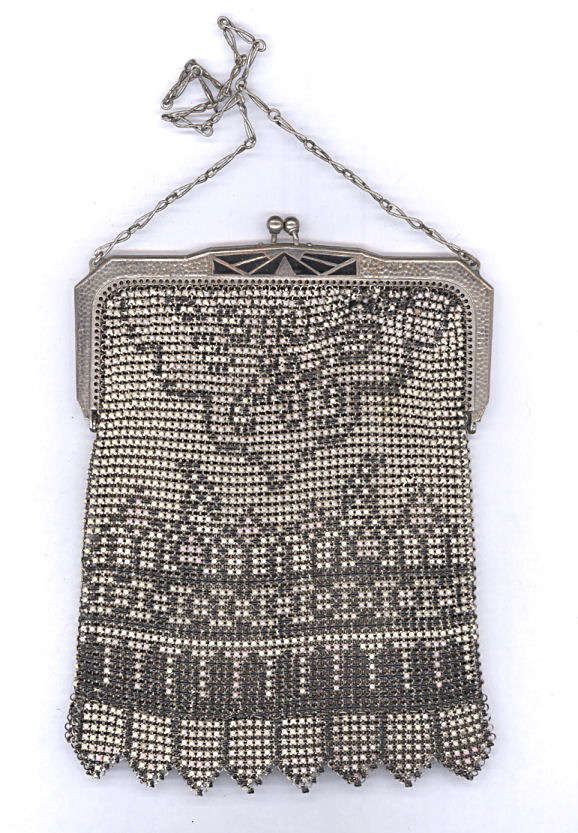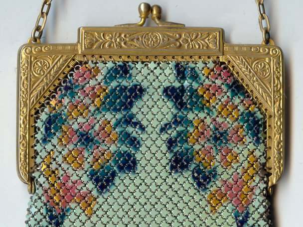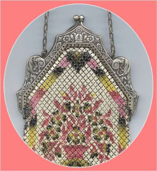 This is a really gorgeous Whiting & Davis Dresden mesh purse in coral pink and blue on a yellow background. The frame is embossed as well as the bars on the chainlink handle. The fringe on this one is extraordinarily nice with a filigree Van Dyke fringe above a chainlink fringe all done in the same muted color. The purse is in very good condition with a wee bit of darkening right under the hinges. There are also a few sporadic chain links missing frm the fringe but because of the way it hangs, you will never notice it. All in all it is a lovely little purse in great conditon. It is marked Whiting & Davis on the inside of the frame. The side is marked Soldered Mesh. Measures 3-3/4" wide at frame x 4-1/2" wide at fringe when hanging straight x 7 " long from top of clasp to bottom of fringe. First time offered! (Click on pic for more photos.) |