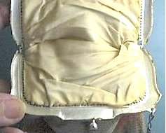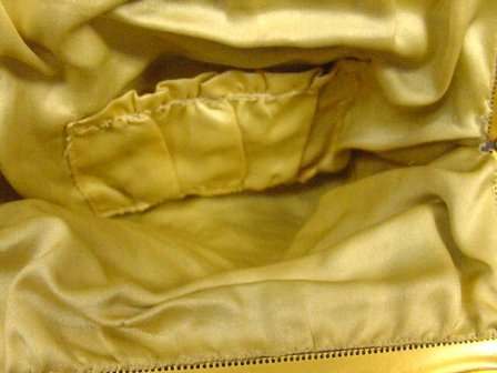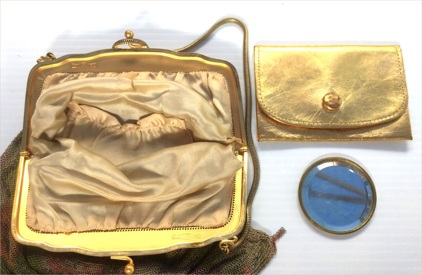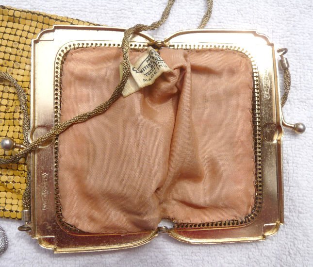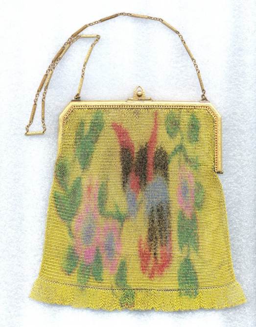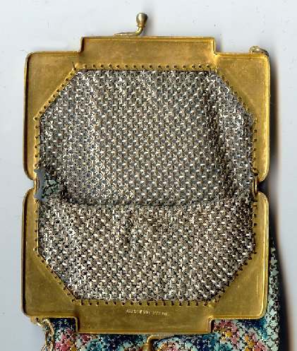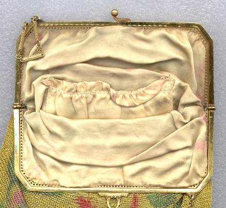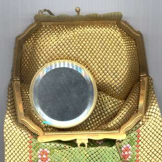 The word "rare" will be frequently found on my website because that is what I specialize in ... rare and unusual purses. I try not to purchase common pieces, so what you see here will be the best of the best. And this one is no exception! Never ran across this purse before ... it is a Whiting & Davis very large size mesh in a beautiful pale yellow shade with green center panel. Bottom is bordered in black with pink flowers ending in Vandyke fringe. The center panel of the front contains a rigid "puffy" area that is actually embossed into the mesh to give the flowers a 3-dimensional look. The back has the same green panel but without the flowers in the center. This is done on a gold-base mesh rather than silver and is finished with an embossed gold frame. The original round beveled mirror was still inside the purse. Measures 5" wide at frame, 9-1/2" long, and 6-1/2" wide across the bottom. It is an OUTSTANDING purse! Previously listed for $950 ... now offered at my cost! (Click on pic for more photos.) |