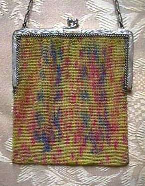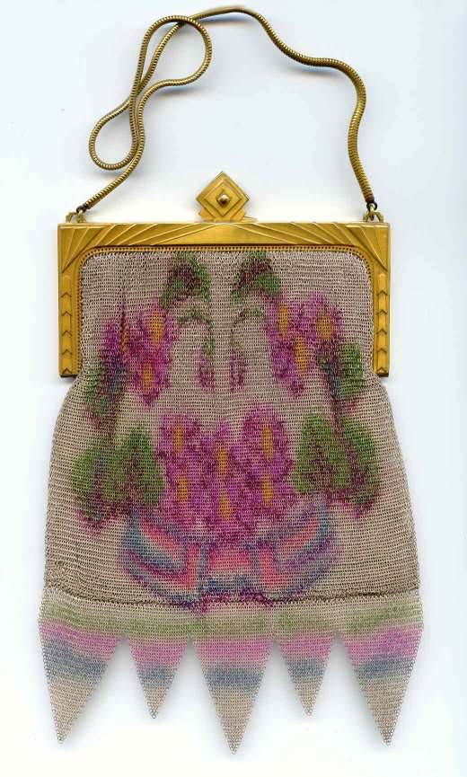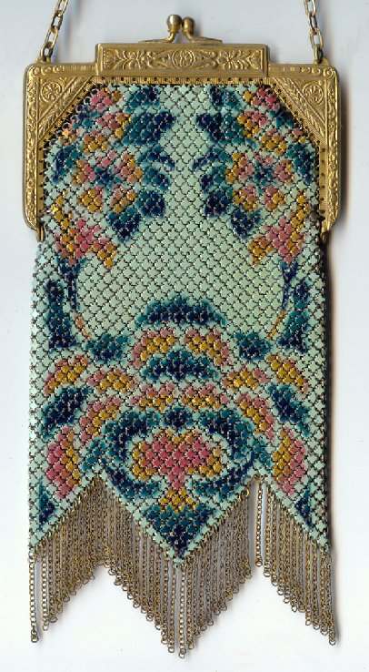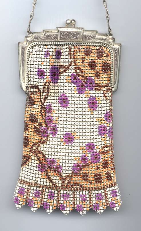 This is one of Whiting & Davis' most attractive Dresden mesh purses (in my humble opinion) and is from my personal collection. I just love the soft colors of pink, green, purple and coral and the way the flowers 'drape' down from the frame. And these same colors are picked up again in a rainbow pattern across the Van Dyke fringe. The beautiful bright gold frame is elegantly embossed and has a high stand-up filigreed snap clasp. Embossed bar and chain link handle finishes it off. Interior is lined in lavender silk with tiny ruched pocket ... and the original round beveled mirror -- albeit beginning to fog from age -- is still inside! This purse has absolutely no apologies ... it is as perfect as the day it was made. Nice large size - measures 5" wide at frame x 8" long to tip of fringe. Previously listed for $550. (Click on pic for more photos.) |
