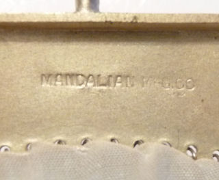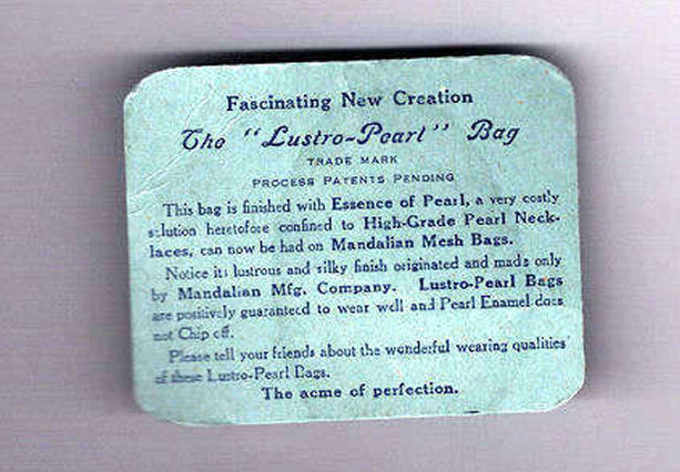 This is a stunning Mandalian mesh purse with the sparkly Lustro-Pearl finish in a rare size and design. Beautifully done in cream with blue, orange and black floral designs on both front and back. Frame is embossed in a very detailed design and the fringe is a stepped version of their typical "V" fringe. Interior is lined in purple silk with some splits but overall mostly intact. Original tag inside which reads "Fascinating New Creation - The 'Lustro-Pearl' Bag - This bag is finished with Essence of Pearl, a very costly solution heretofore confined to High-Grade Pearl Necklaces, can now be had on Mandalian Mesh Bags. Notice its lustrous and silky finish originated and made only by Mandalian Mfg. Com. Lustro-Pearl Bags are positively guaranteed to wear well and Pearl Enamel does not chip off." The outside of the bag is all in mint condition! Measures 4-1/2" wide at frame x just a bit over 8" in length overall. Previously listed for $650. (Click on pic for more photos.) |