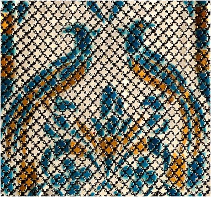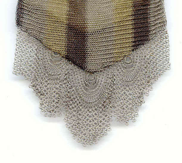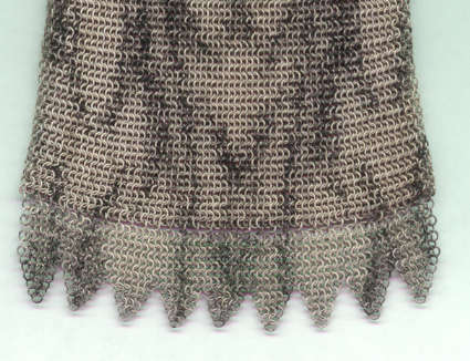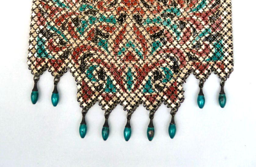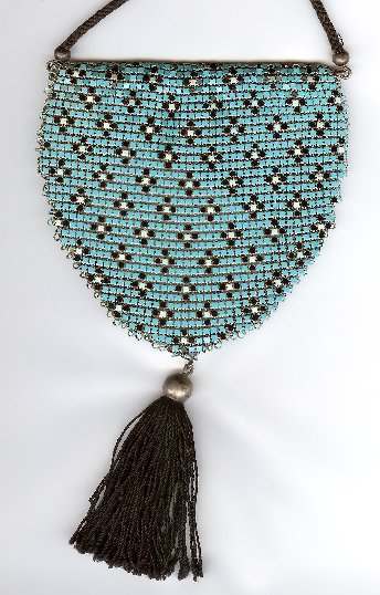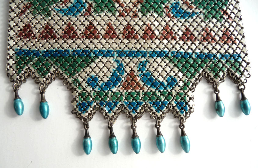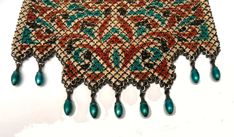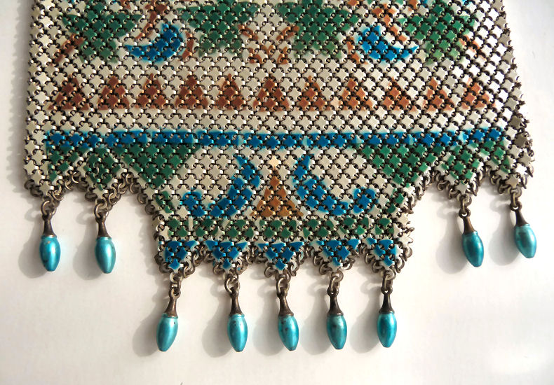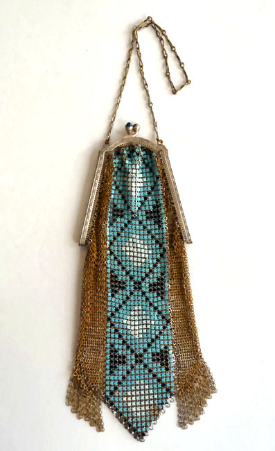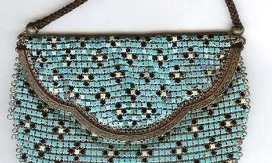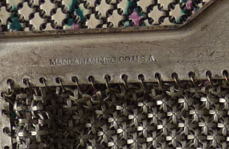 Mandalian makes some of the finest mesh purses you will ever run across and this one is in a rarely found Mosaic design in lustro-pearl finish. Lovely shades of turquoise and black on a silvery pearly background ... just stunning! The frame is embossed with openwork corners and the fringe is Van Dyke style chainlinks. Both sides of the purse have the same exact design. Overall in excellent condition ... only problem worth mentioning is a bit of detachment on one armpit near the hinge but not bad at all. Enameling is all excellent! Measures 4-1/4" wide x 9" long from clasp to fringe. First time listed! (Click on pic for more photos.) |