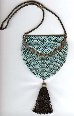 Here is another truly marvelous Mandalian lustro-pearl mesh purse with my favorite teardrop fringe. This one is done in unusual colors of an Indian summer with a deep ecru background, coppery bronze, deep teal, and black. The teardrops are done in an Indian red shade to match the purse. The frame and chainlink handle on this one are unusual in that they are gold tone rather than silver. This picks up the shimmery tones of the purse to utmost advantage. Interior is lined in a beige silk that is in perfect shape, it has just pulled away from the frame about halfway around. This should be a simple restitching job for nimble fingers ;-). The fringe is near perfect with ony two tiny flecks missing on two of the tips ... these are only visible if looked upon from the bottom. It is a truly stunning purse and one I have not seen before. Measures 4-1/2" wide x nearly 10" long! Previously listed for $899! (Click on pic for more photos.) |