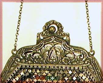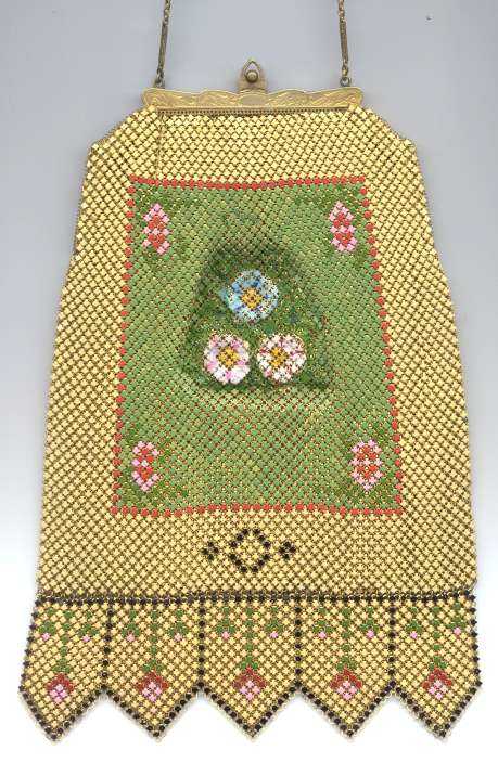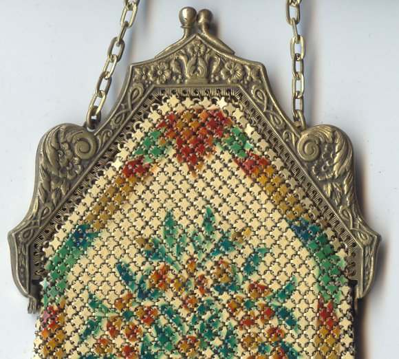 This is a very rare Whiting & Davis Dresden mesh purse in a very large size and a style of frame that I have never had before (this one has been in my collection since 2006. The size is also exceptionally large ... it is 5" wide at the hinge x over 6" wide at the bottom x 9" long to tip of fringe. The design is an impressionistic looking bouquet of flowers with callal lillies and roses amonst others. The design is the same on both sides and the colors "drip" into the fringe which is just gorgeous. The frame -- which as I mentioned I have never seen another like it -- is bright gold with embossed triangular shapes with diamond cut curlicues in each one. Inside is lined with a gold silk and there is a gold coin purse with a round beveled mirror inside. With the exception of the lining being loose at the hinges, this entire purse is in MINT condition. It is signed on the frame inside and has a snake chain handle. It has long been a prize in my collection and now it can belong to you. First time offered. (Click on pic for more photos.) |