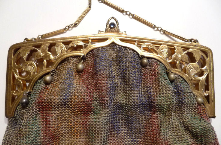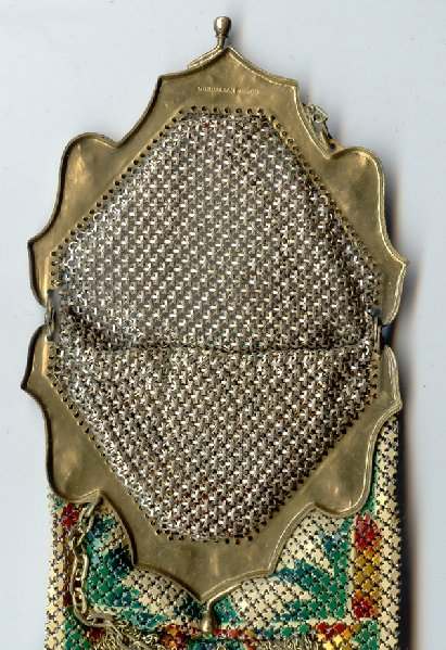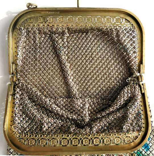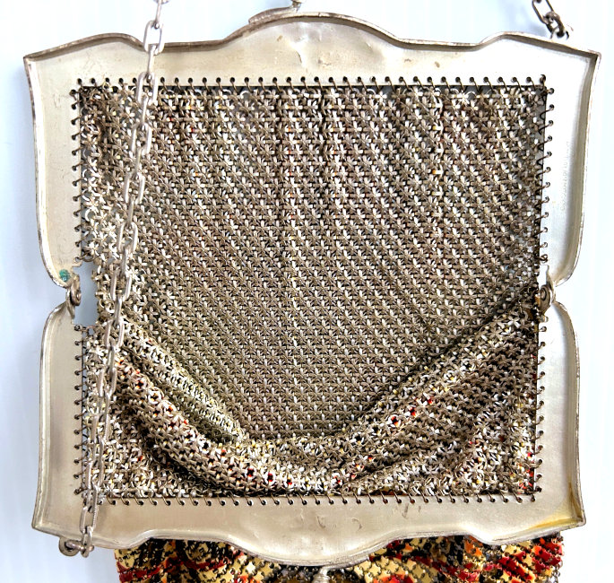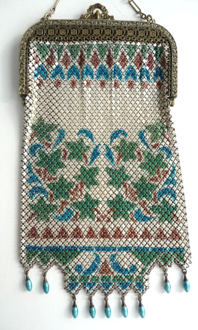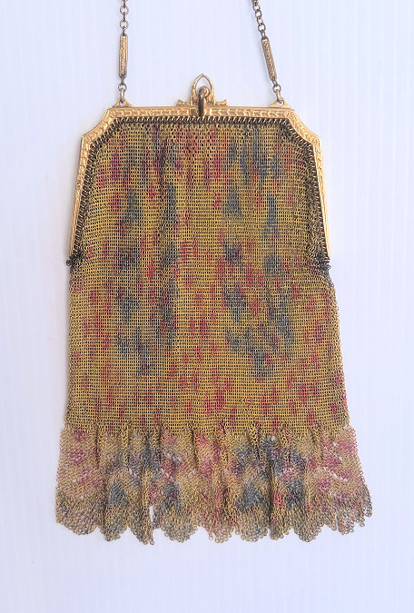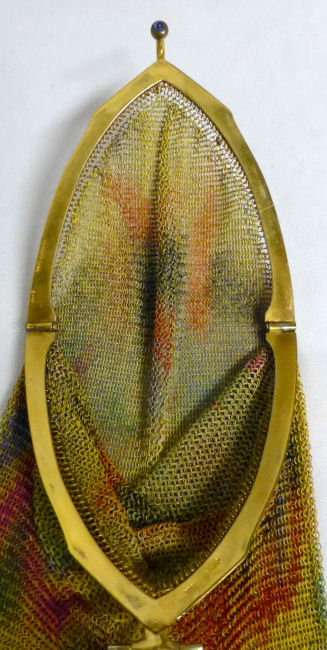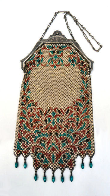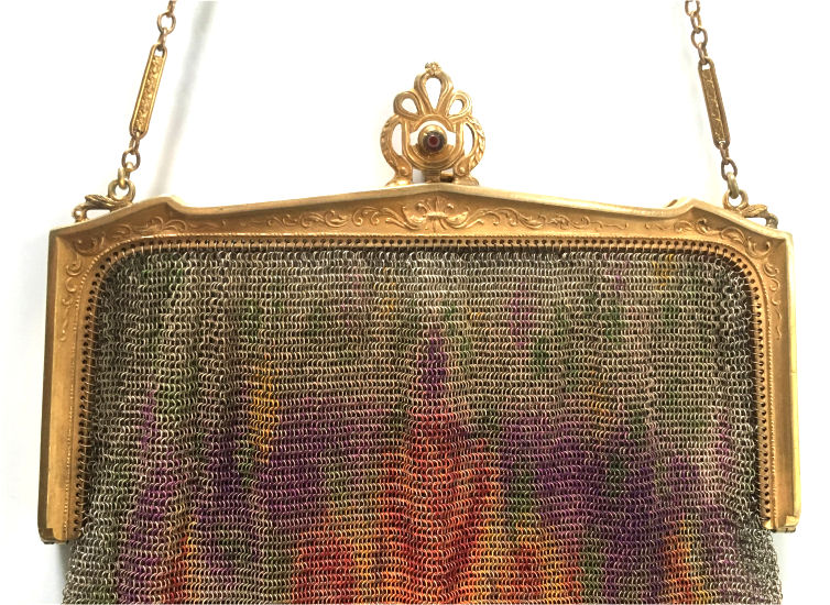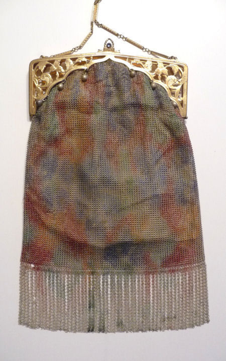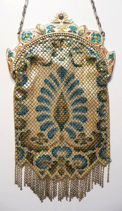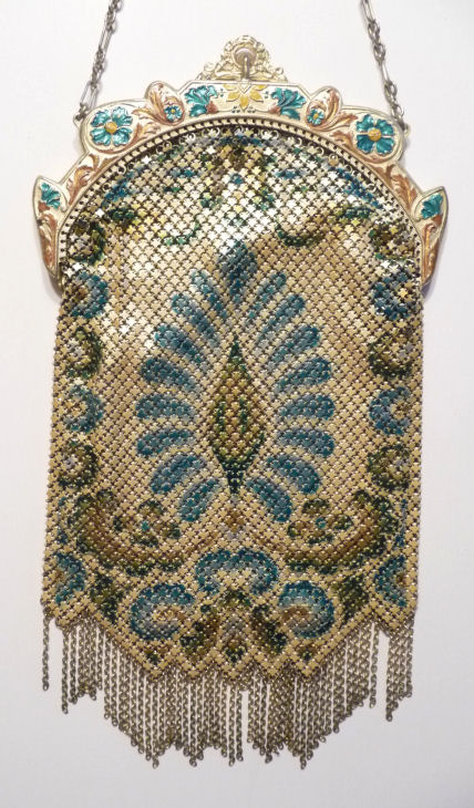 In all my years of collecting, I have never run across another like this one. It has been in my collection for several years but I am now passing it along for another person to enjoy. Believe it or not, it is signed by Whiting & Davis and it is soldered mesh. The colors on the purse resemble watercolor they are so liquid looking in the way they ebb and flow. The frame is just extraordinary! Heavy openworked acanthus leaves with an arched scalloped shape at the purse edge. At each little curve is a beaded dangle. The clasp is set with a blue sapphire. Both sides of the frame are identical and the beads repeat on the back as well. Interior is lined in pale gold silk with tiny ruched pocket. The colors from the purse extend down into the long chainlink drop fringe. Chain handle is the typical bar and chainlink style W & D is known for. This entire purse is in fantastic condition with no missing links, tears, or damage of any kind. It is just gorgeous! Measures 5" wide at hinge, 6" wide at bottom of fringe when hanging, and 9-1/2" long from clasp to fringe. First time listed! (Click on pic for more photos.) |