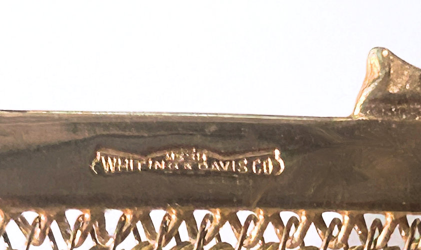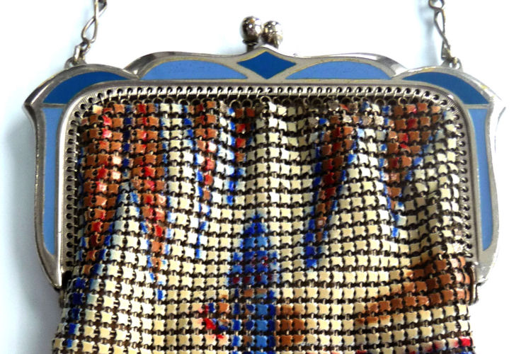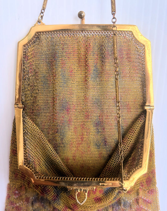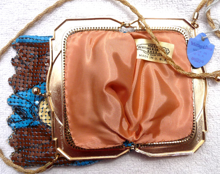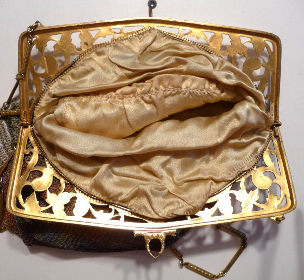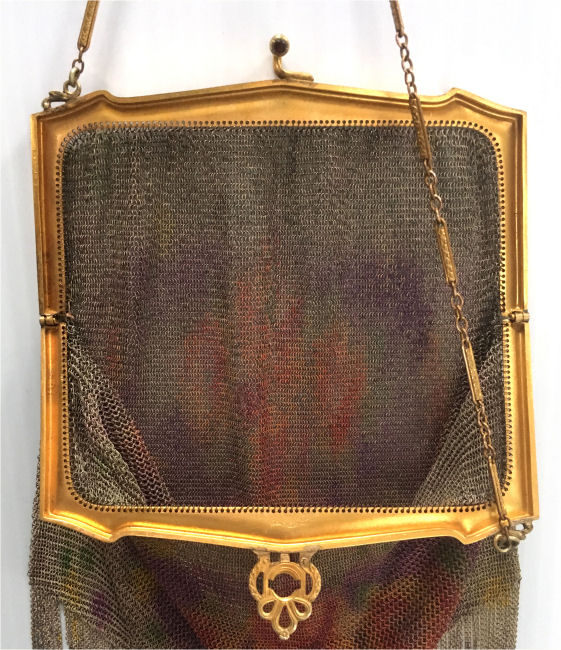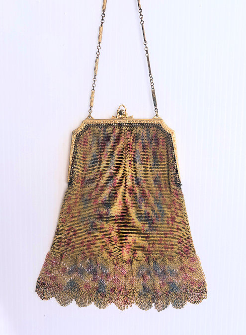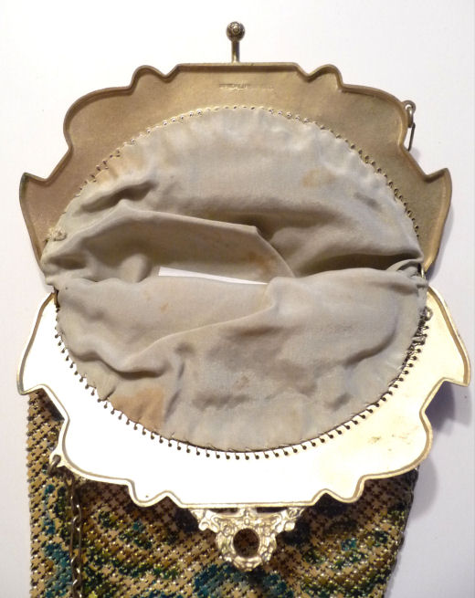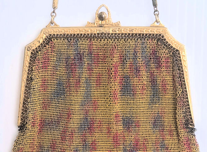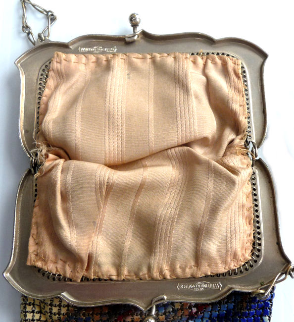 In all my years of collecting, I have never run across another like this one. It has been in my collection for several years but I am now passing it along for another person to enjoy. Believe it or not, it is signed by Whiting & Davis and it is soldered mesh. The colors on the purse resemble watercolor they are so liquid looking in the way they ebb and flow. The frame is just extraordinary! Heavy openworked acanthus leaves with an arched scalloped shape at the purse edge. At each little curve is a beaded dangle. The clasp is set with a blue sapphire. Both sides of the frame are identical and the beads repeat on the back as well. Interior is lined in pale gold silk with tiny ruched pocket. The colors from the purse extend down into the long chainlink drop fringe. Chain handle is the typical bar and chainlink style W & D is known for. This entire purse is in fantastic condition with no missing links, tears, or damage of any kind. It is just gorgeous! Measures 5" wide at hinge, 6" wide at bottom of fringe when hanging, and 9-1/2" long from clasp to fringe. First time listed! (Click on pic for more photos.) |