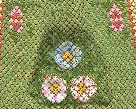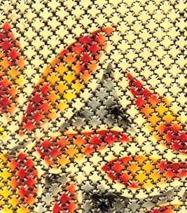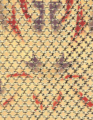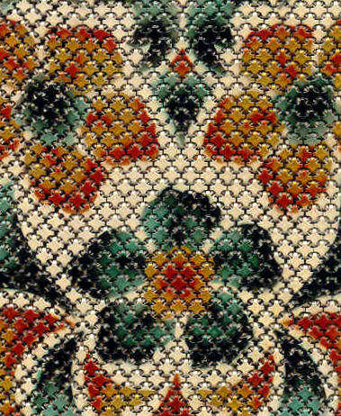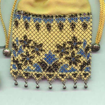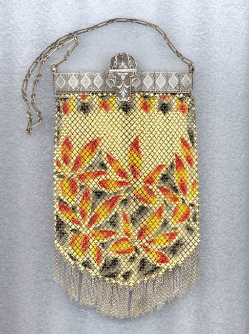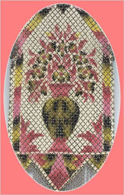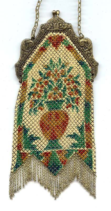 This is a lovely Mandalian mesh purse with vase of flowers on the front and back. This one is done in very unusual colors of gold, Indian Summer red, and green on a cream background which gives the purse a very autumnish feel. The enameling has a lustro-pearl look to it and the frame and fringe are gold. This is a beautiful mesh bag and it is in perfect condition throughout. Design is straight, not crooked as the scan makes it look. Measures 3-1/2" wide at frame x 8" in length overall. Previously listed for $650. (Click on pic for more photos.) |