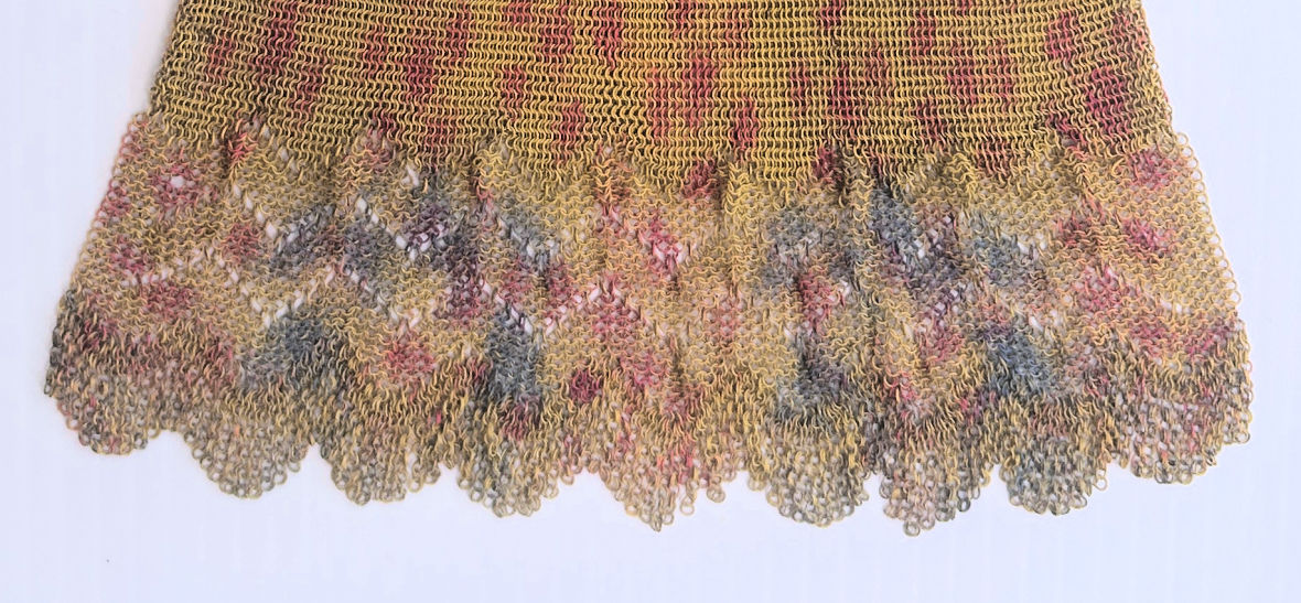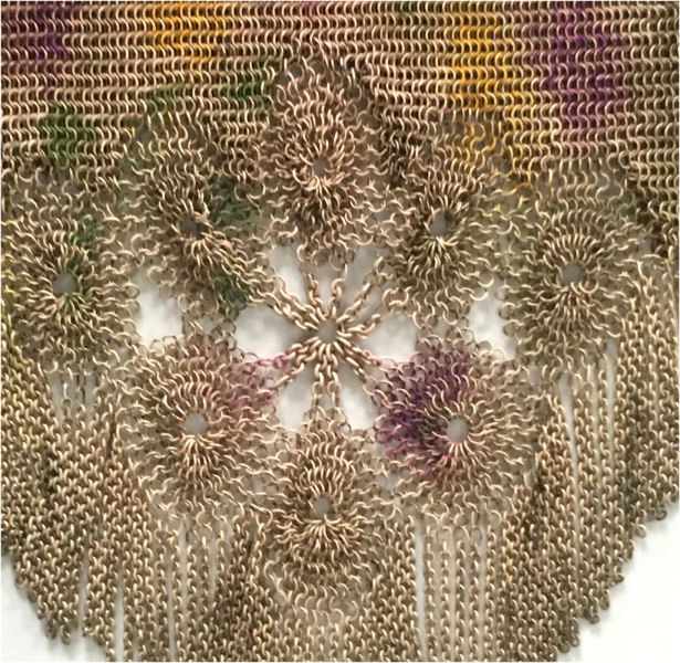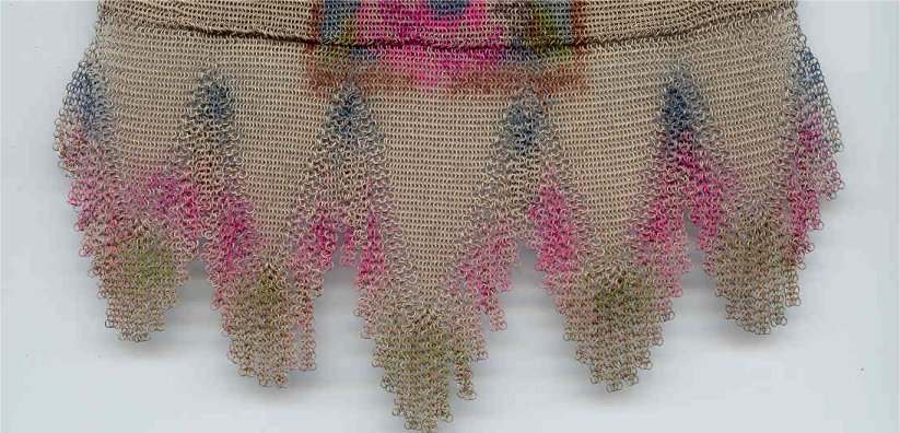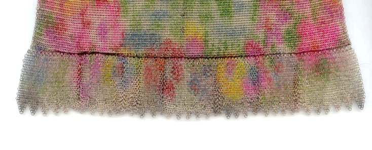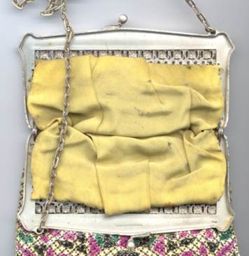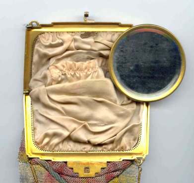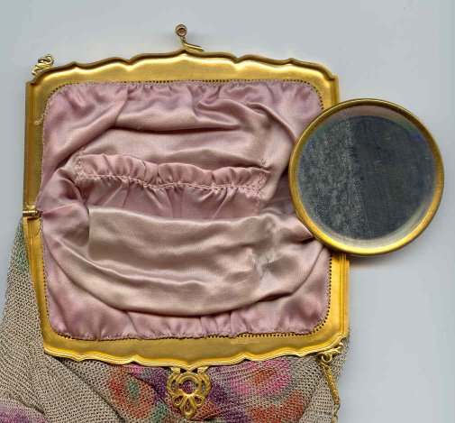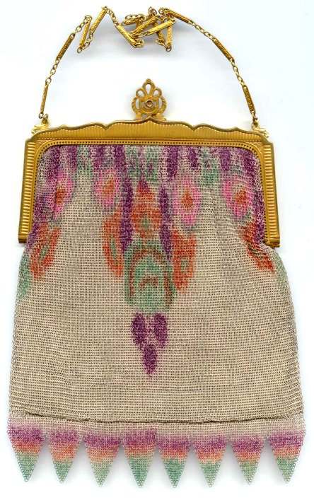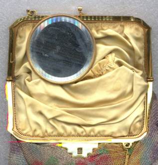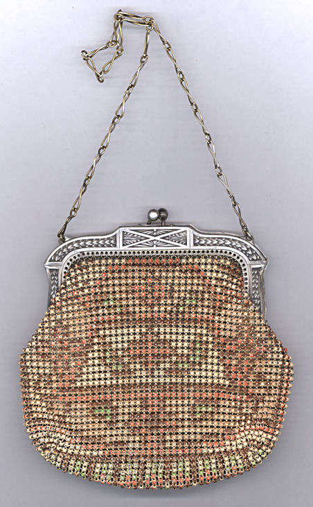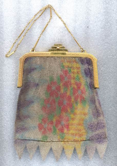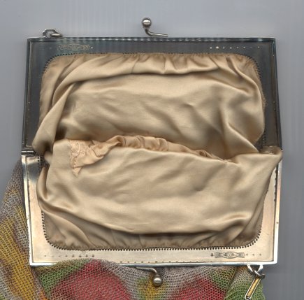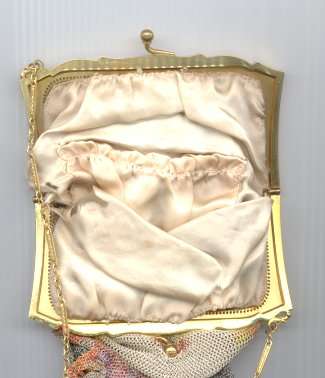 >This is one of the prettiest Whiting & Davis Dresden mesh purses that I have owned ... I just love the soft colors in the flowers and particularly in the soft rainbow stripes in the pointed VanDyke fringe. The inside is lined in a lovely pale lilac silk with tiny ruched pocket which still holds its original round beveled mirror. The snakelink chain handle sets off the deco embossed frame perfectly! This purse is in fantastic condition with no apologies anywhere ... back of purse is identical to front. Excellent colors and all mesh is attached firmly to frame. Just a beauty! Measures 5" wide x 9" long overall. Previously listed for $550. (Click on pic for more photos.) |