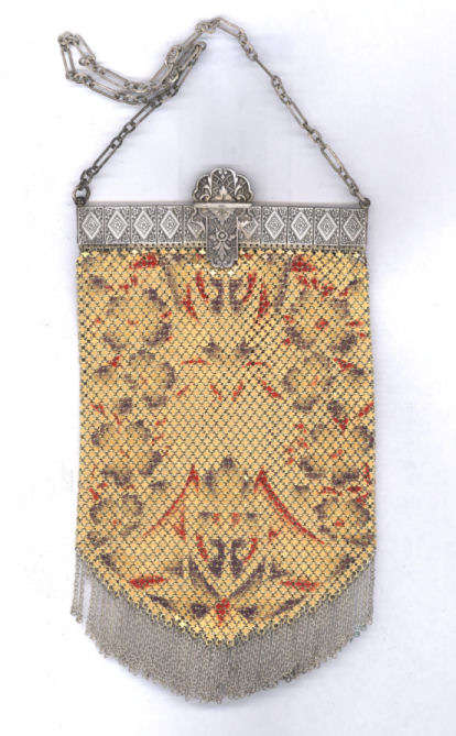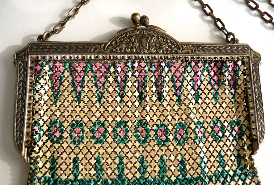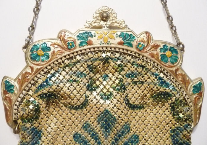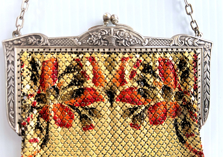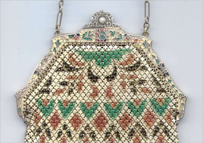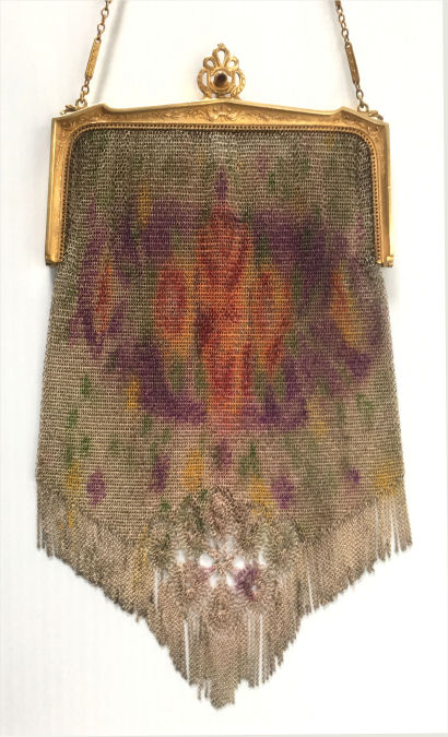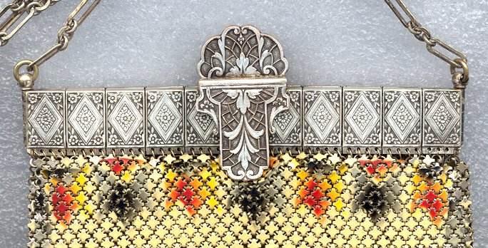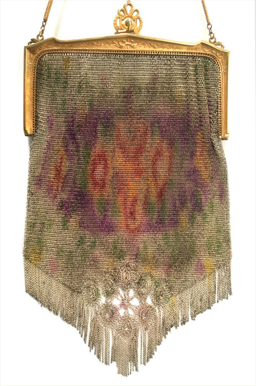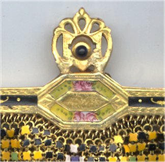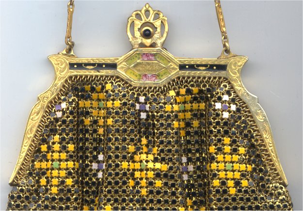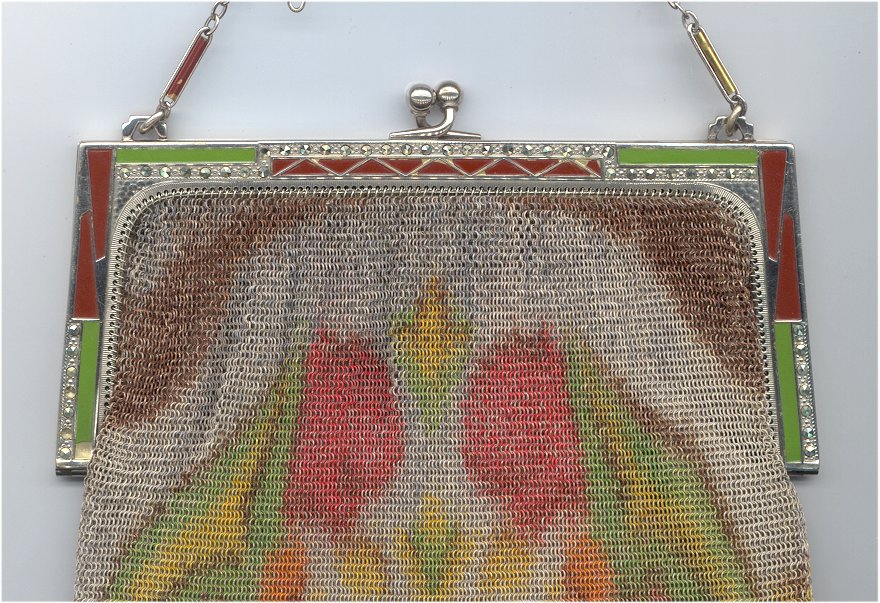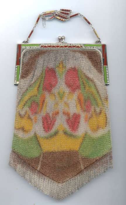 Wow! What a stunning enamel mesh purse this one is ... made by Mandalian, it features a lovely vase of flowers on both sides and gorgeous framework done in enameling all around it. Set off with an ornately embossed cathedral shaped frame, this is truly one of Mandalian's finest examples. That is why I purchased it even though several of the chainlink fringes were missing. These are easily enough repaired and this purse is so rare that it was worth purchasing regardless of the fringe. Enameling is in excellent condition and mesh is all tight to the frame. There is one detached link under the hinge on one side, but this is very minor and not visible unless upon close inspection. Overall I would rate it an 8 out of 10 condition-wise. Very bright and vivid colors! Measures 3-1/2" wide at fringe x 8" long. Previously listed for $625! (Click on pic for more photos.) |