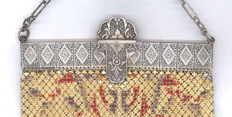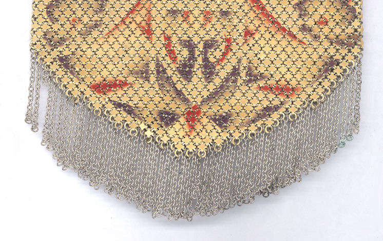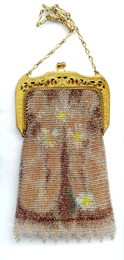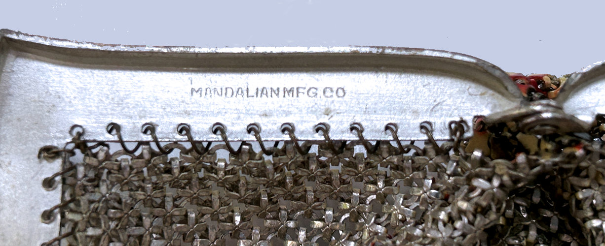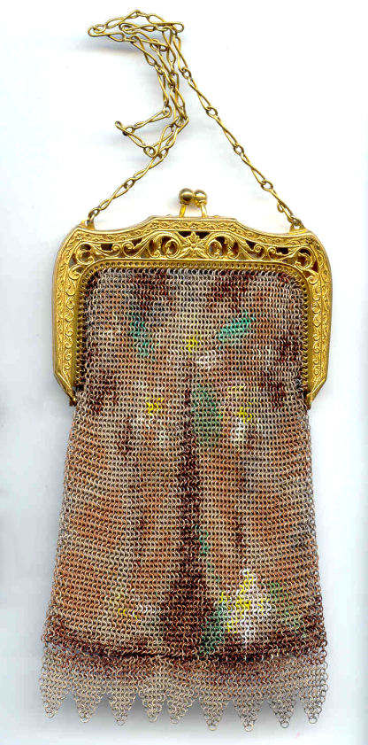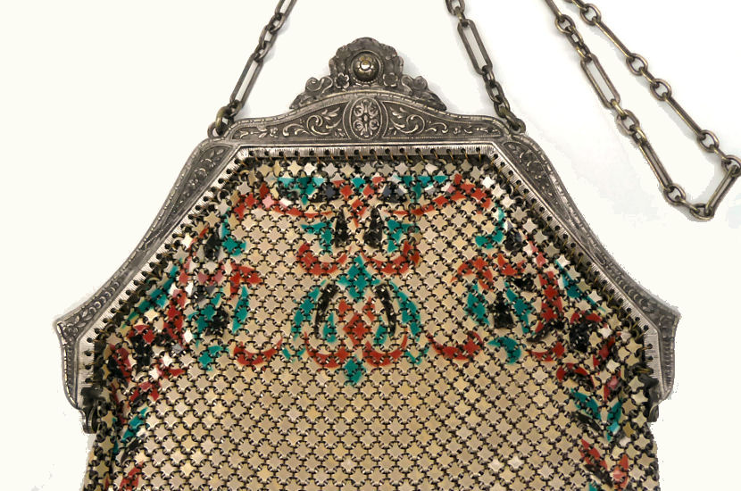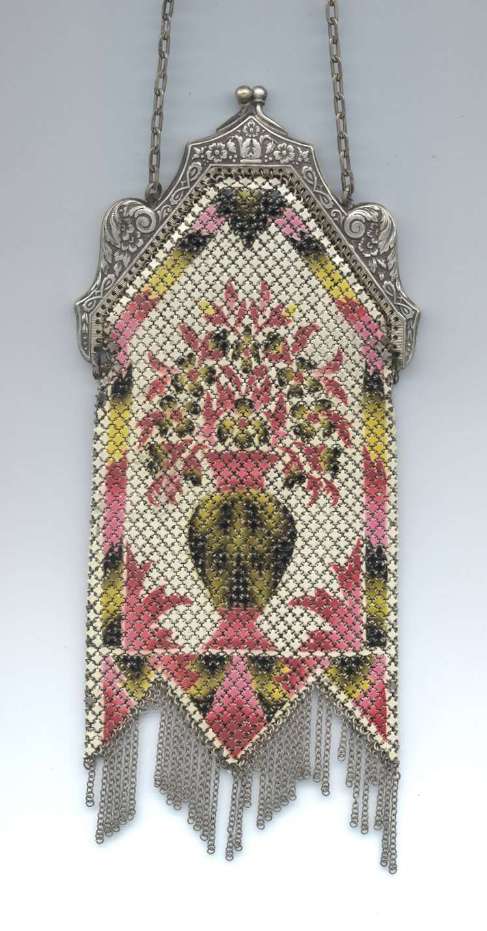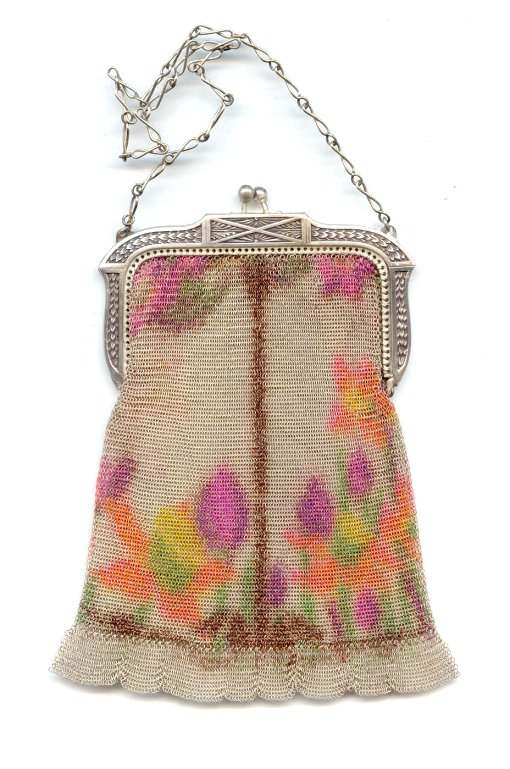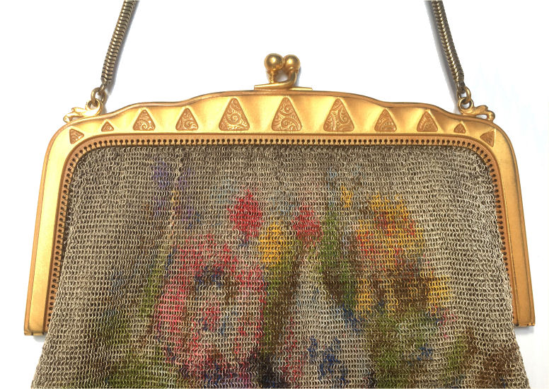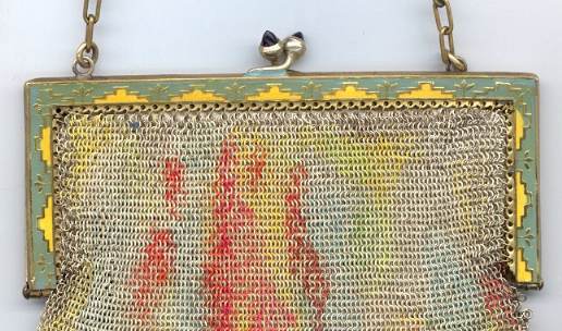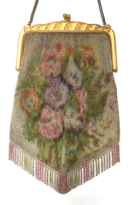 Wow! What a stunning enamel mesh purse this one is ... made by Mandalian, it features a lovely vase of flowers on both sides and gorgeous framework done in enameling all around it. Set off with an ornately embossed cathedral shaped frame, this is truly one of Mandalian's finest examples. That is why I purchased it even though several of the chainlink fringes were missing. These are easily enough repaired and this purse is so rare that it was worth purchasing regardless of the fringe. Enameling is in excellent condition and mesh is all tight to the frame. There is one detached link under the hinge on one side, but this is very minor and not visible unless upon close inspection. Overall I would rate it an 8 out of 10 condition-wise. Very bright and vivid colors! Measures 3-1/2" wide at fringe x 8" long. Previously listed for $625! (Click on pic for more photos.) |