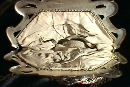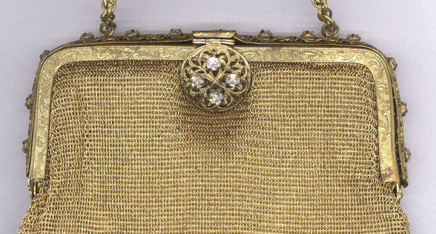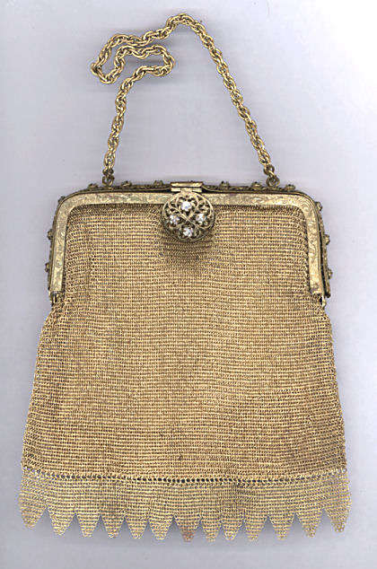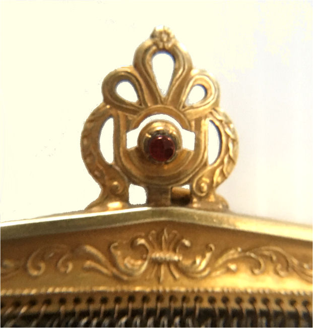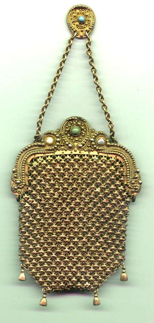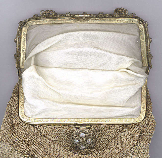 This is a very unusual and rare purse in very tiny gold ring mesh and a stunning filigreed and jeweled frame. I can't find a maker's name on it, so I'm not certain or the origin. It is extremely fine quality with 13 prong-set crystal jewels all around the frame and 4 on the filigreed clasp ... 17 jewels in all! The interior is lined in cream silk and the interior of the frame is embossed with a lovely acanthus leaf design. Bottom of purse is finished in Van Dyke fringe. This purse came from a private local collection and has not been offered publicly before. Purse is in excellent condition throughout and measures 5" wide at frame x 6-1//2" long not counting chain handle. Previously listed for $695. (Click on pic for more photos.) |