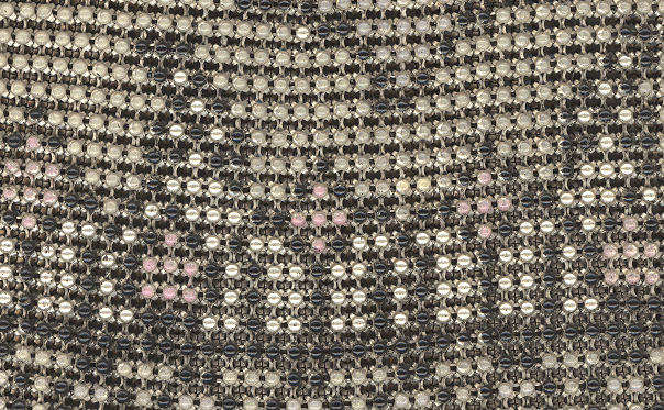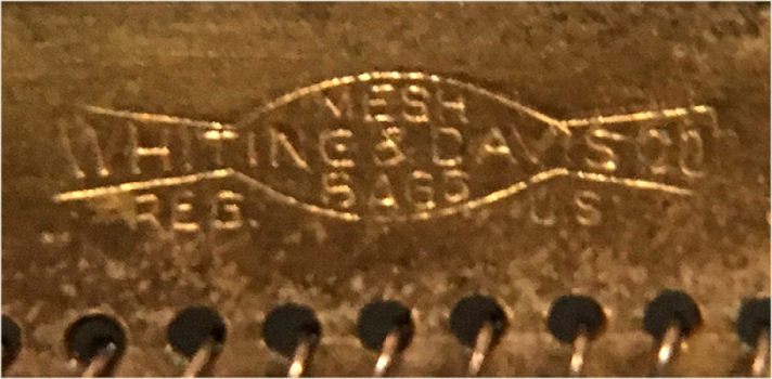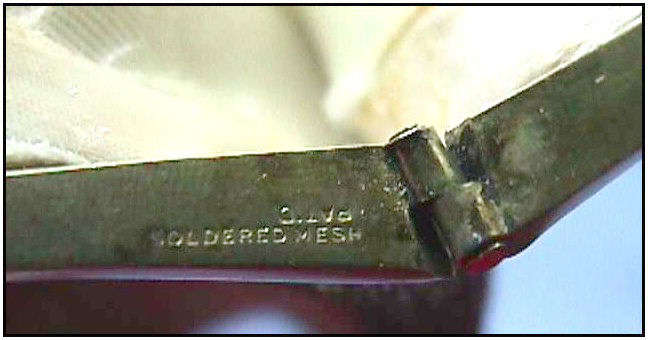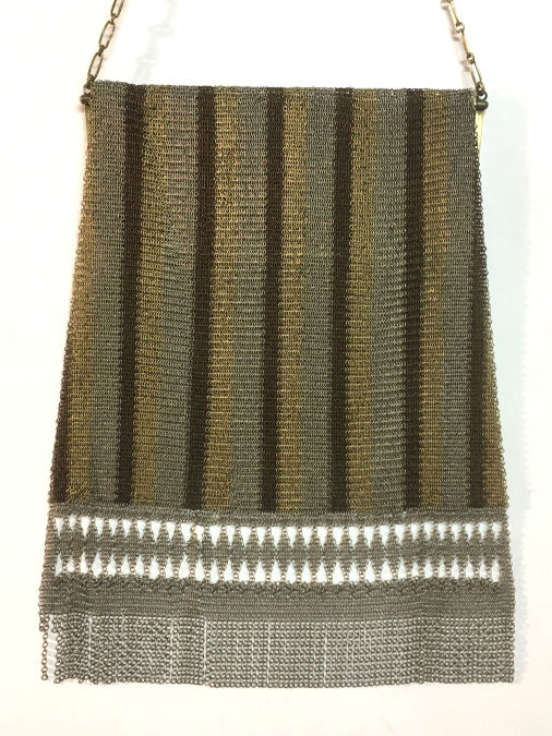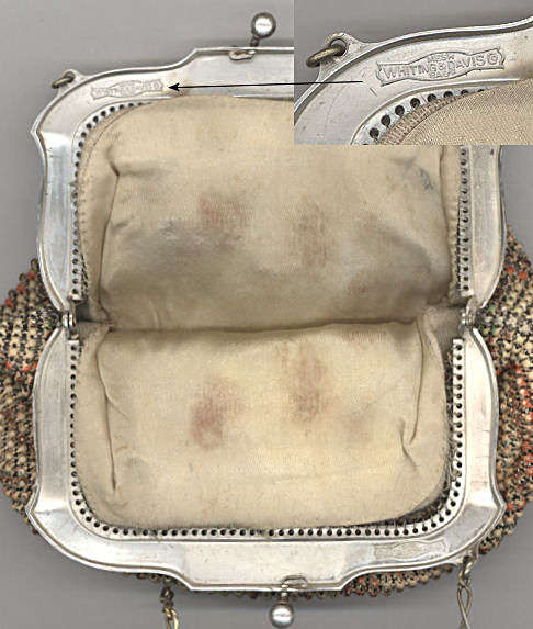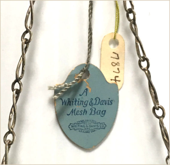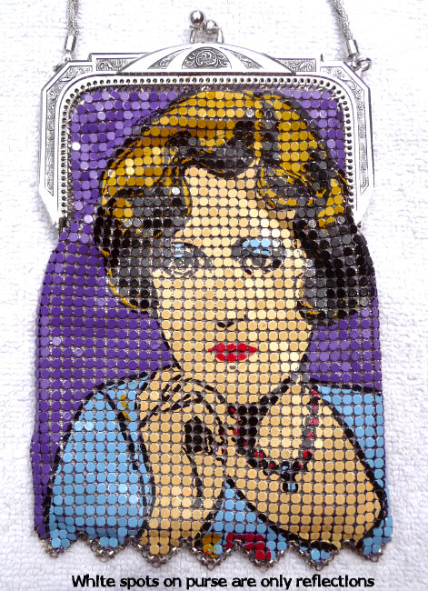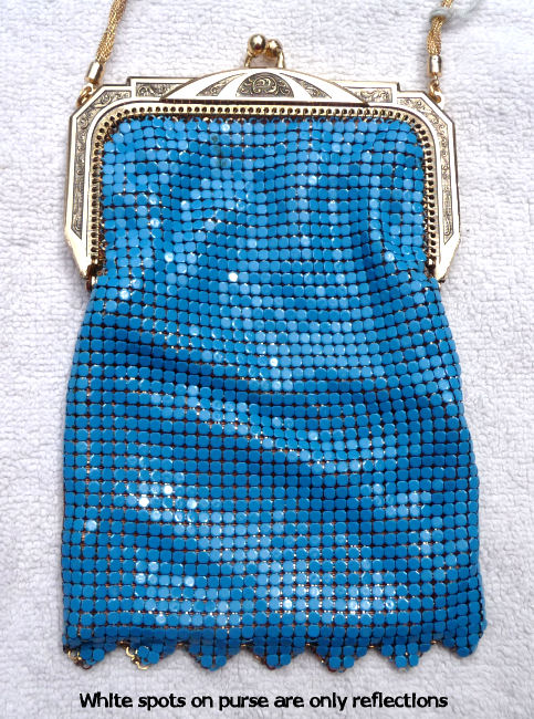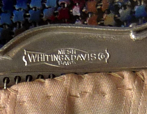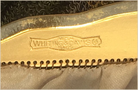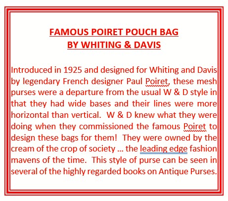 This is my mystery Whiting & Davis pouch style purse ... it's in the shorter/wider style of Paul Poiret's designs, but it is done in Beadlite instead of armor mesh. Beadlite refers to a style of beads that Whiting & Davis developed to resemble glass beads ... instead of flat mesh tiles, each little tile is rounded with a dome shape. This is a very rare style purse that I have not been able to find anywhere. It's definitely an earlier piece. Interior is lined in white silk that shows some wear and is detached from the frame a bit. However, ALL of the mesh is tight to the frame and is in very good condition. Some very minor enamel loss on the tops of the domes mostly around the outer edges ... not very noticeable at all ... overall color is very good. Measures 5" wide at frame x 7-3/4" long. Previously listed for $650. (Click on pic for more photos.) |