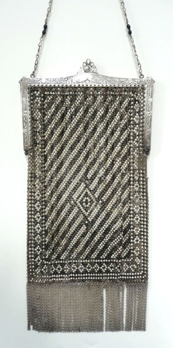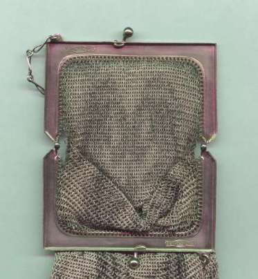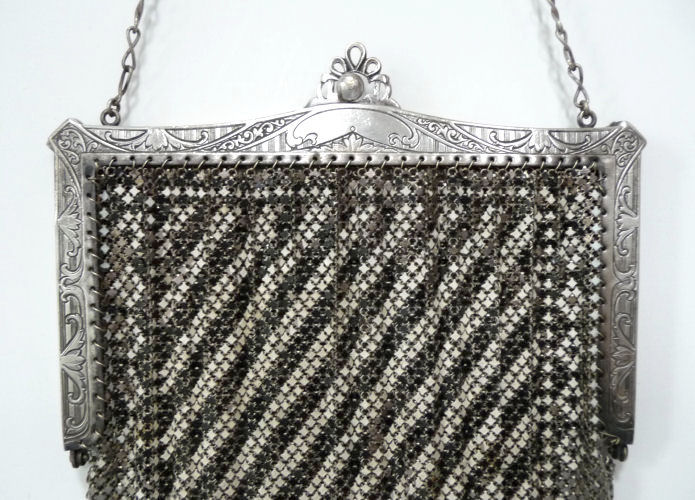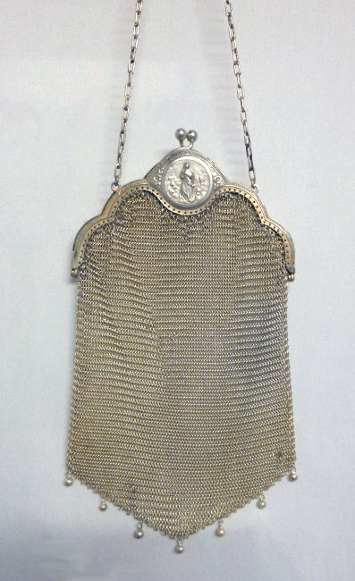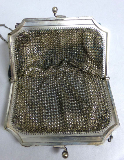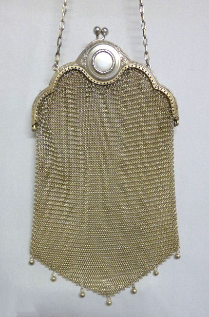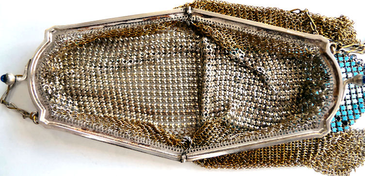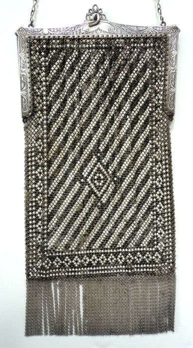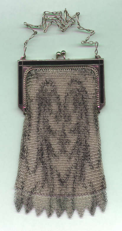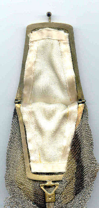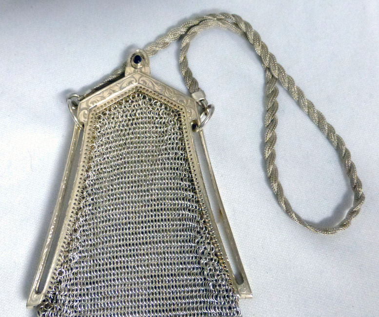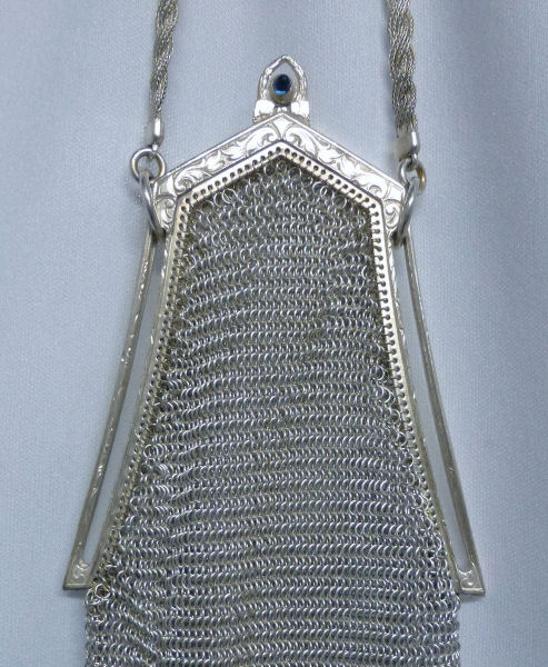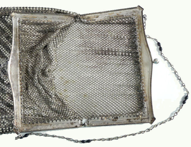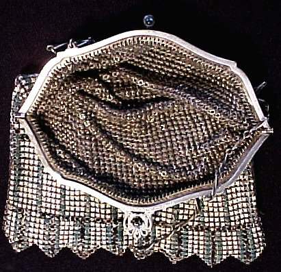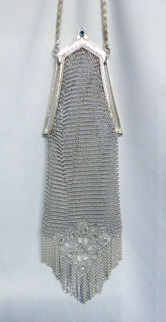 I believe this is an unmarked Whiting & Davis mesh purse done in silver fine ring mesh. It does tarnish and polish just like sterling silver but I am unable to find any silver hallmarks; however, it is my opinion that it is sterling. The sides have a slide-lock mechanism that when held by the beautiful braided handle (be sure to see pics), the rings slide up the sides and keep the purse locked closed. To open it, you simply slide the rings down and release the sapphire jeweled clasp. It is a very clever design and one that I have seen before on W & D purses, so that is why I assumed it was W & D. What makes this purse super special is the beautiful Venetian lace fringe .. the ring mesh is designed in such a way that it resembles the finest Venetian laces done in Italy in the early last century. It is in mint condition and is a real beauty! Measures 2-34" wide at bottom of frame x 3-1/4" wide at fringe x 9-1/2 " long from top of clasp to bottom of fringe. First time offered! (Click on pic for more photos.) |