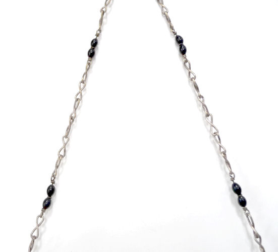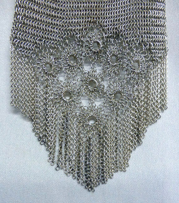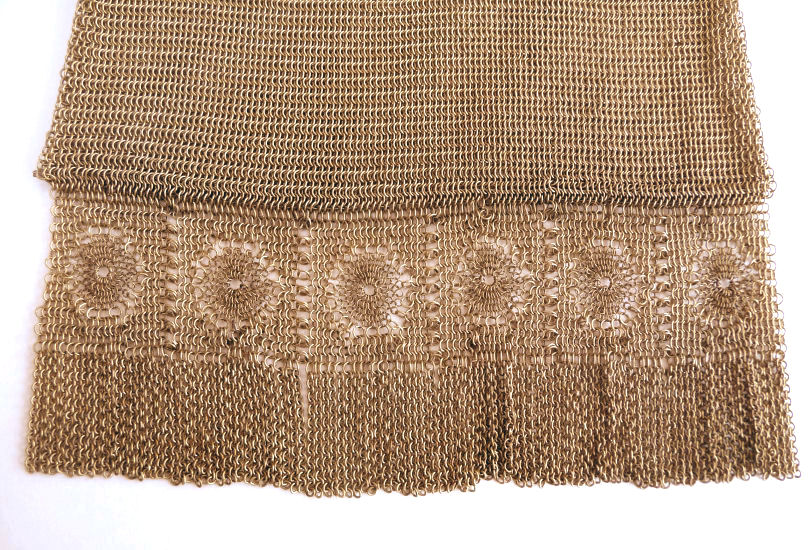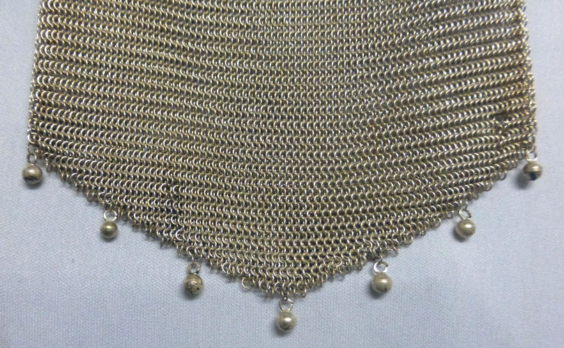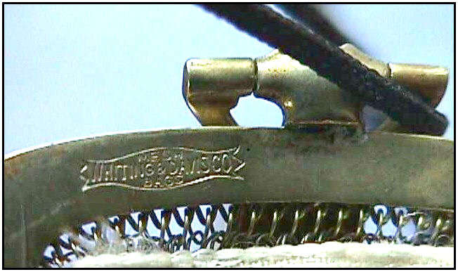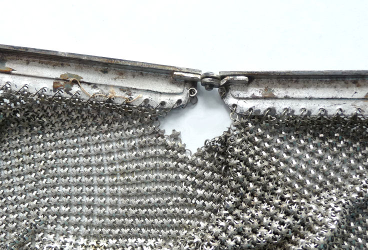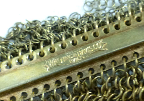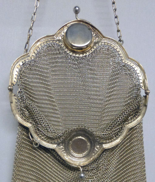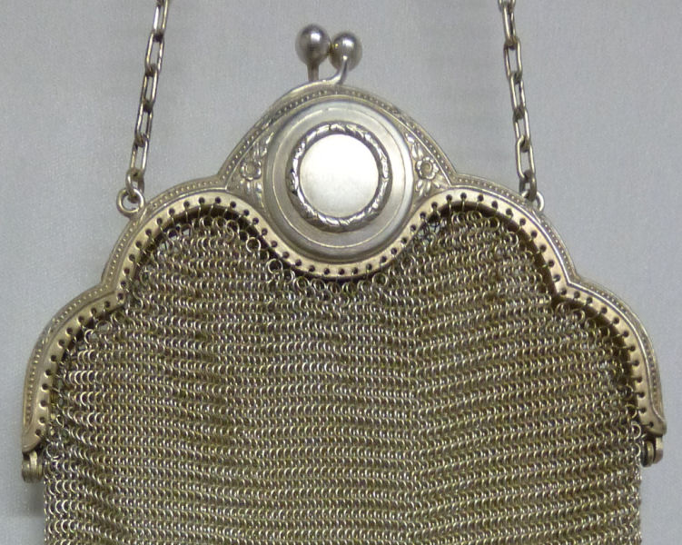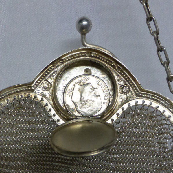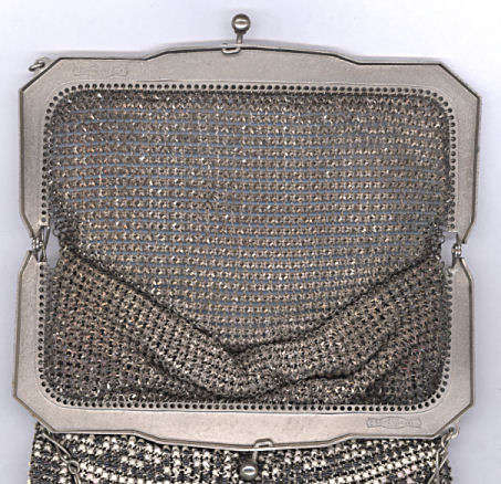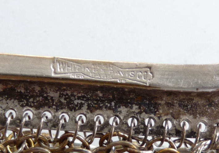 I believe this is an unmarked Whiting & Davis mesh purse done in silver fine ring mesh. It does tarnish and polish just like sterling silver but I am unable to find any silver hallmarks; however, it is my opinion that it is sterling. The sides have a slide-lock mechanism that when held by the beautiful braided handle (be sure to see pics), the rings slide up the sides and keep the purse locked closed. To open it, you simply slide the rings down and release the sapphire jeweled clasp. It is a very clever design and one that I have seen before on W & D purses, so that is why I assumed it was W & D. What makes this purse super special is the beautiful Venetian lace fringe .. the ring mesh is designed in such a way that it resembles the finest Venetian laces done in Italy in the early last century. It is in mint condition and is a real beauty! Measures 2-34" wide at bottom of frame x 3-1/4" wide at fringe x 9-1/2 " long from top of clasp to bottom of fringe. First time offered! (Click on pic for more photos.) |