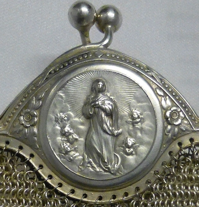 This is a very beautiful purse and unlike any I have ever seen before. In fact it has been in my personal collection for quite a few years and I am not ready to part with it. The frame is shaped in multiple scallops culminating in a center medallion with a figural image of the Holy Mother Mary holding a baby Jesus in her arms. Surrounding her are several tiny angels all facing her. Inside the purse there is a "secret" compartment built into the frame which can hold pills or a few small coins. It does not have a visible catch hence my description of "secret". The frame is stamped "ALPACA" denoting that it is made of Alpaca silver. The bottom is finished off in tiny bead ball fringe. As for condition: there are a few areas where the links have separated creating tiny holes but overall these are not very noticeable or significant and it is possible that a jeweler or someone with better eyes than mine could simply reattach them. It is a rather large purse for mesh measuring 4-1/2" wide at the frame x 5" wide at the bottom x 8-1/2" long from clasp to center bead fringe. The handle adds another almost 7" in height. First time listed! (Click on pic for more photos.) |