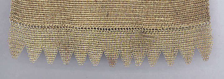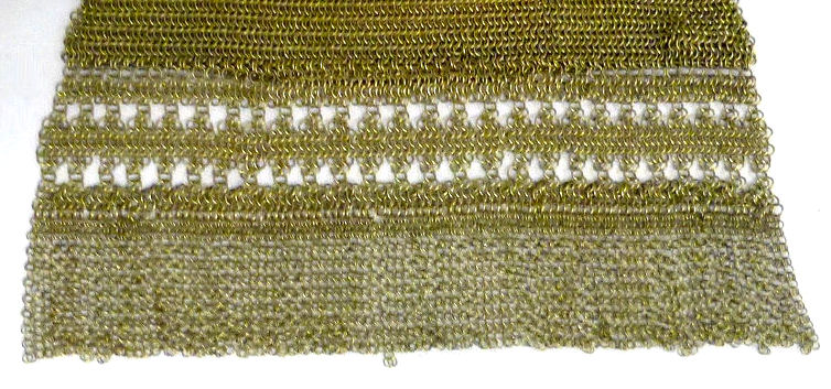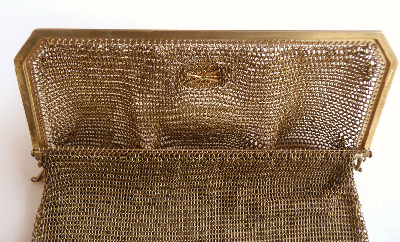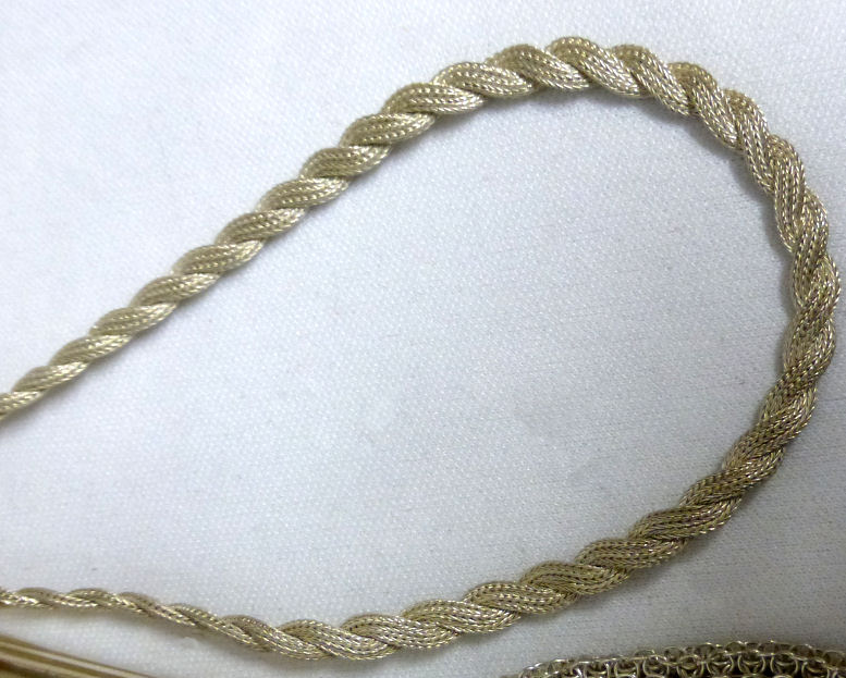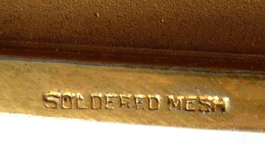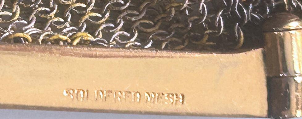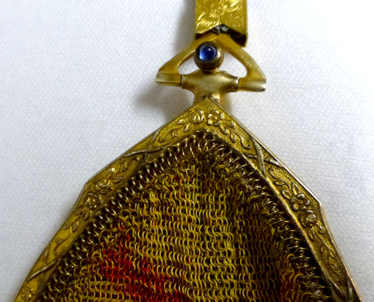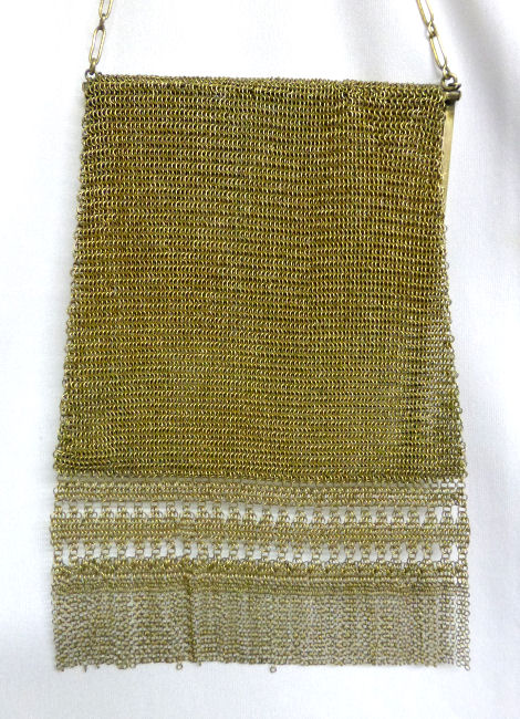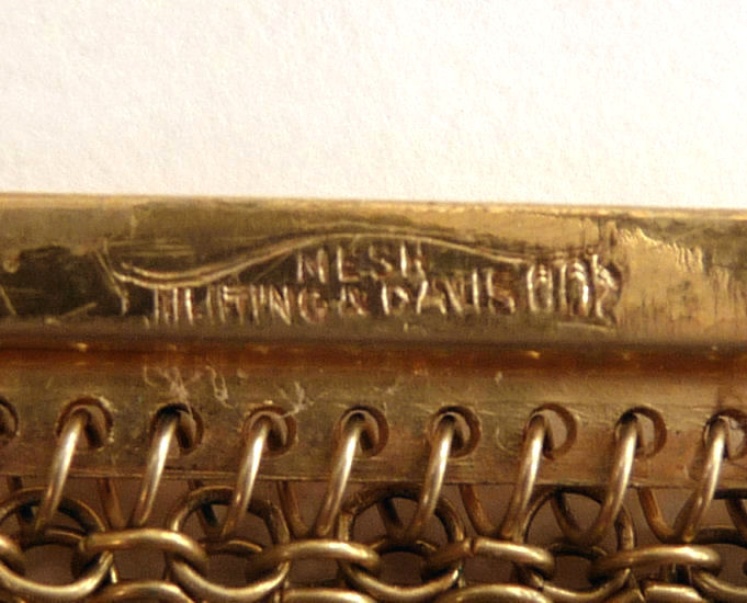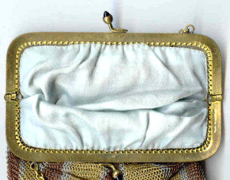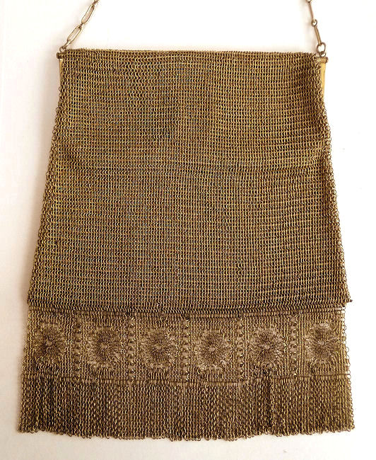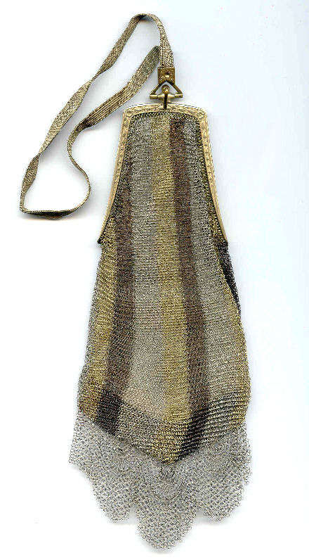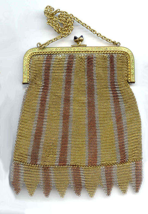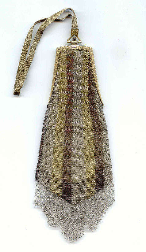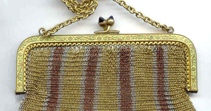 As you all know by now, I do love the unusual! What turns my head in a mesh purse is when I run across one that I haven't seen before ... and this one certainly fits the bill! Done in three colors of mesh -- gold, bronze & silver, known as "Sunset mesh", this one not only has an unusual frame with a jeweled clasp and braided wrist handle but also is finished with the extremely rare Venetian lace fringe, a personal favorite of mine. It is called Venetian lace because the tiny mesh rings are intricately linked together to create a lacy design like the finest lace from Venice. The pretty gold frame is beautifully embossed and topped with a blue sapphire clasp. Interior is lined in ivory silk in excellent condition. Mesh is perfect with no missing links or holes. Measures 1-3/4" wide at top of frame, 2-1/2" wide across bottom of frame, 3-1/2" wide across bottom x almost 9-1/2" long not counting handle. Previously listed for $599. (Click on pic for more photos.) |