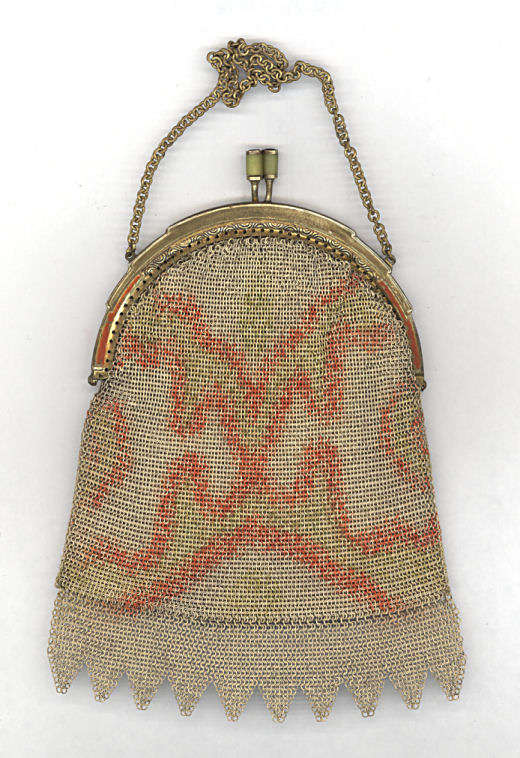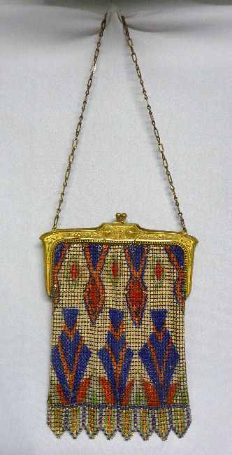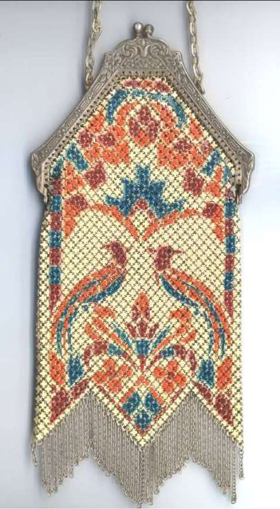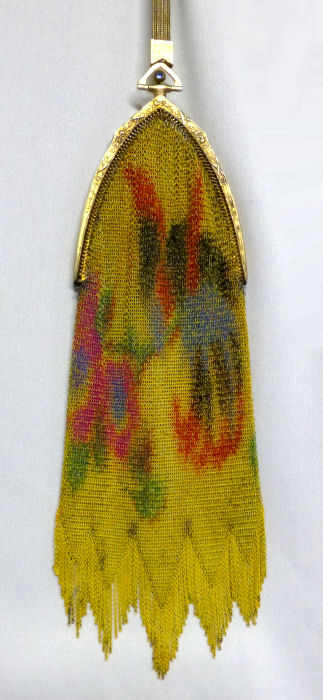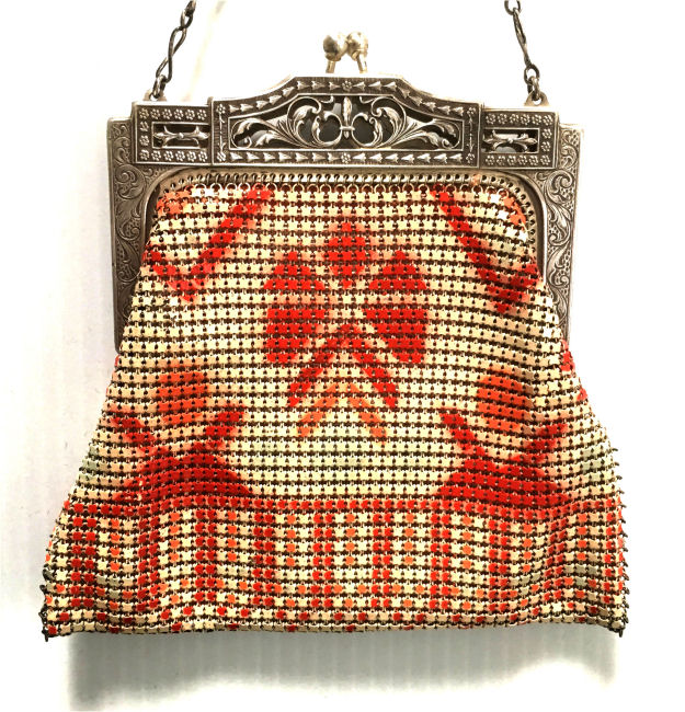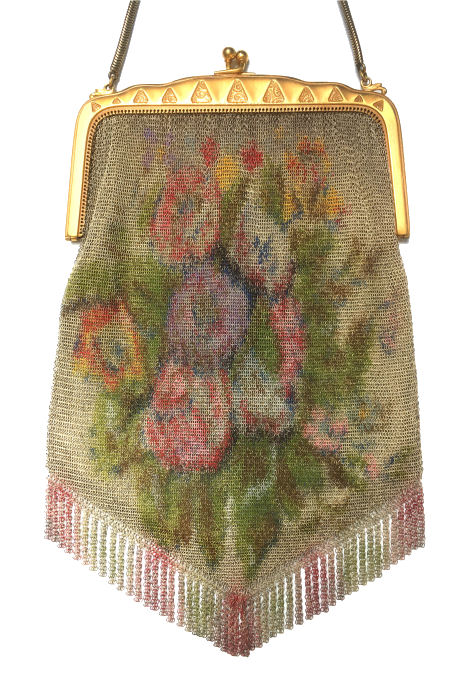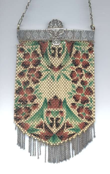 This is a very unusual Mandalian mesh purse in a style and colors that are rarely found. Finish is lustro-pearl, and the frame is a widened "A" style openwork embossed design. Two-level Van-dyke fringe is tipped with teardrop dangles. Overall the purse is in excellent condition. Upon very close inspection, however, there is some enamel loss on the tiles right against the frame and along the edges of the purse. It blends in so well with the colors as to really be unnoticeable and is insignificant in a purse of this rarity. The teardrop dangles are a nice deep patina in a bronze shade. Colors on purse are creamy background and flowers with orange centers and petals of green, black and rust. There are one or two links loose right under the hinge that could be easily re-attached by someone with better vision than I! All in all, a great purse in a hard-to-find example. Measures 4-1/2" wide x 9-1/2" long to bottom of fringe. Previously listed for $850. (Click on pic for more photos.) |