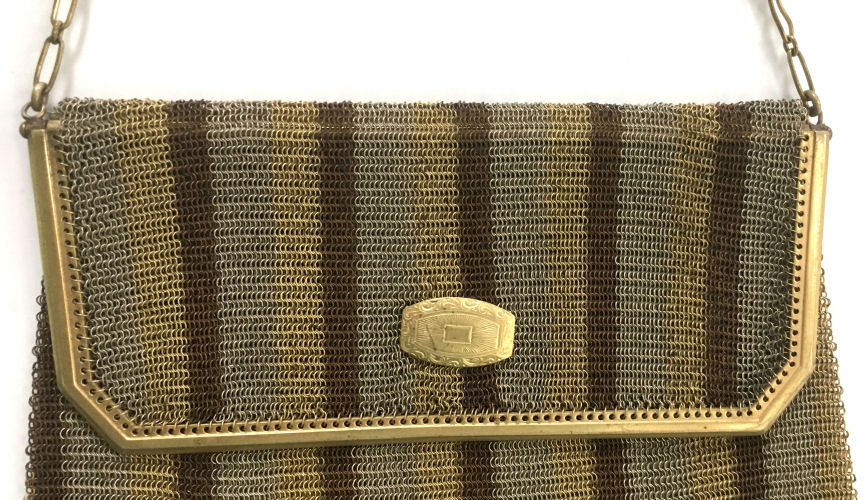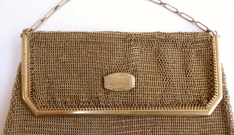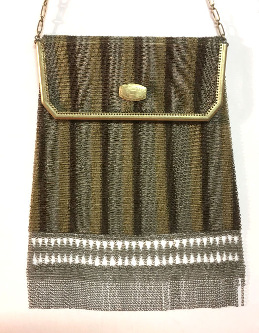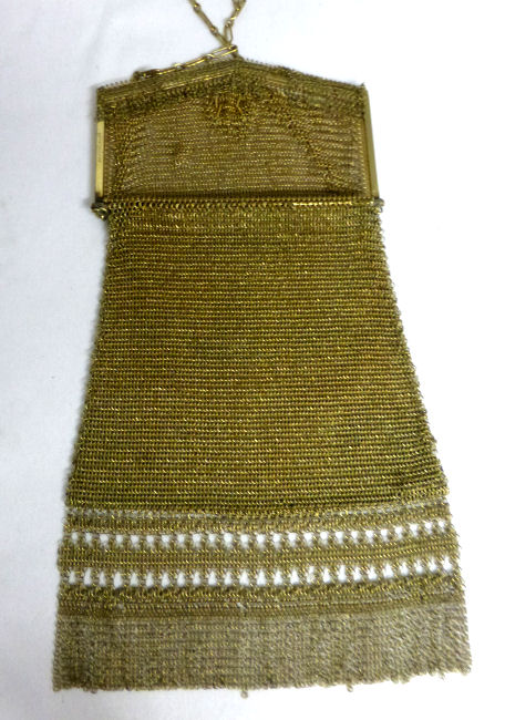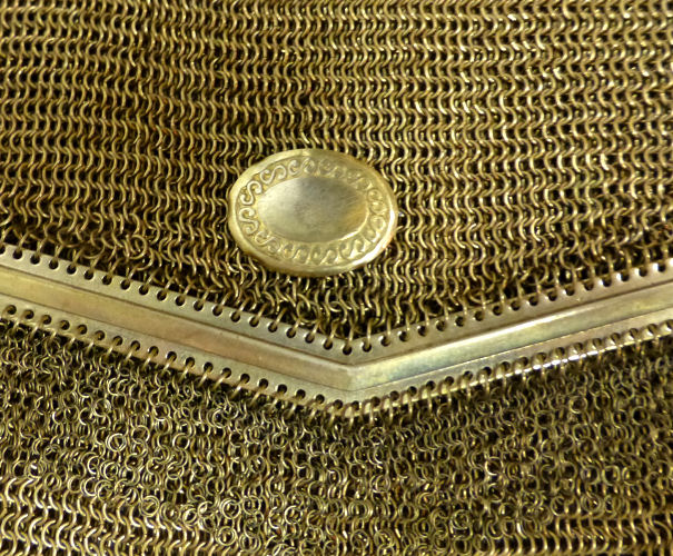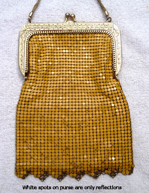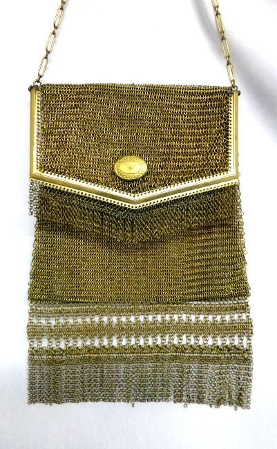 This mesh purse is a rare design in that it is a Whiting & Davis Princess Mary style purse (meaning the top opens like an envelope folded over), it is a sunset mesh pattern (which refers to the stripes in gradient shades of gold), and it is a super large size that I have not seen before. Plus the foldover flap has a rigid frame around it and a medallion vignette decoration which I have not run across before. The fringe is a delight in that it is 2 layers: the first is an openwork diamond pattern made up of tiny chain links with a solid band beneath it and long single length chainlink fringe below that. All in all a pretty rare example of this style purse and a real beauty to boot! The mesh is all in excellent condition with no holes. In fact, the only apology is that two of the chainlink fringes are missing some of the tiny links, an easy fix if you have the links at hand. Measures 5" wide at frame x 5-1/2" wide at fringe x 7-1/2" long from top of frame to bottom of fringe. (Click on pic for more photos.) |