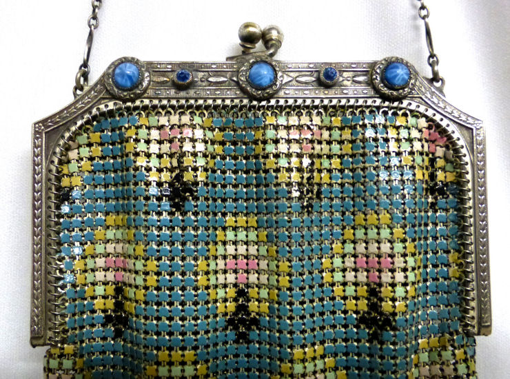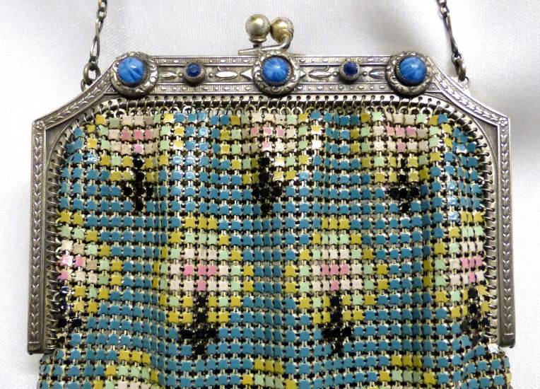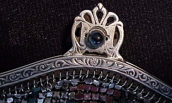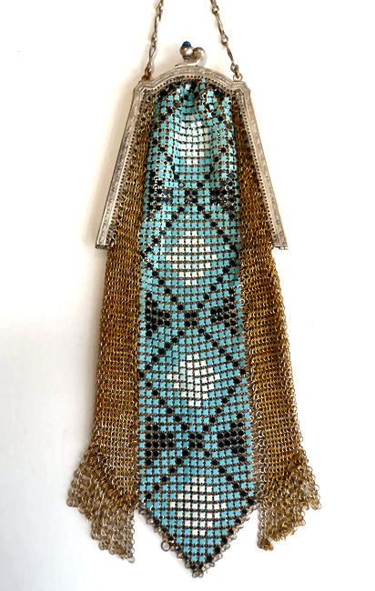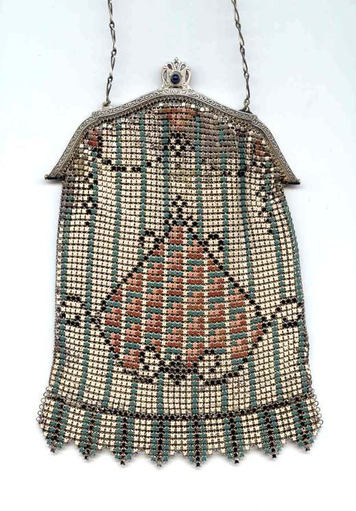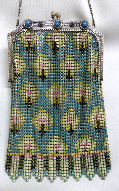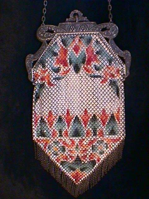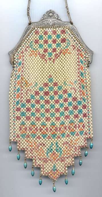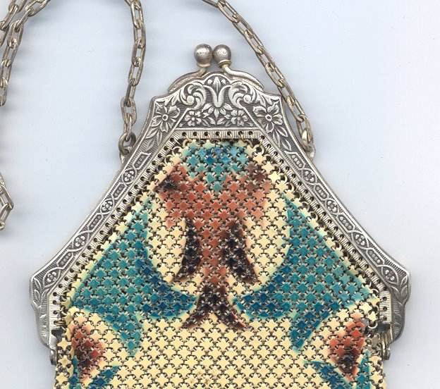 This is a very unusually shaped Whiting & Davis mesh purse with a modified cathedral frame and sapphire jeweled clasp. It is oversized, measuring 5" wide x 8" long and has a very pretty Art Nouveau design on the front. Colors are white background with teal stripes, pink and teal design in center outlined with black curlicues. There is a cascade at the top with roses above each. Striped Van Dyke fringe finishes the purse. This is such a pretty purse and so unique that I purchased it for my personal collection even though it has enamel loss in several areas. It blends in well with the design and really isn't very noticeable at a glance ... purse is priced accordingly. Previously listed for $325. (Click on pic for more photos.) |