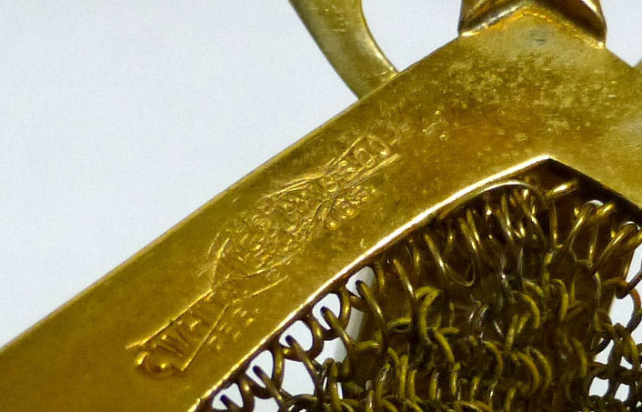 This is a very rare Whiting & Davis Dresden mesh purse in all gold with a sapphire jeweled clasp and lovely Venetian lace inset fringe. It comes with a braided handle with a double slide to adjust it to fit your wrist ... what an elegant accompaniment to wear dancing! It's unique slim frame opens quite deep to access to this elongated purse. Frame is richly embossed on both sides. Overall, the purse is in perfect condition with no loose or missing links anywhere. It is all tight to the frame and the Venetian lace is as good as they get. Measures only 1-3/4" wide at the bottom of the frame x 9" long. Handle is another 6" and purse measures 3" wide across the bottom. Previously listed for $450. (Click on pic for more photos.) |