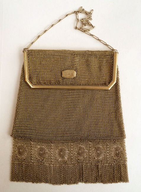 Princess Mary style purses -- meaning they have a foldover style flap -- have always appealed to me and I have had several variations of these over the years in my collection, this one being one of my favorites. The frame front has a gold button type medallion in the center for decoration and beveled corners for accent. But what really sets this one off is the gorgeous and rare Venetian Lace fringe which is finished below with another long lush chainlink fringe. Awesome! It is in excellent condition. It is marked Whiting & Davis on one side of the frame. The other side is marked Soldered Mesh and Made in Canada. Whiting & Davis opened their Canadian factory in 1914 and the Princess Mary style purse was created in the 1920's. Measures 5" wide at frame x 6" wide at fringe x 7 " long from top edge to bottom of fringe. First time offered! (Click on pic for more photos.) |