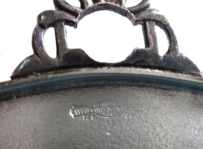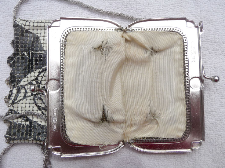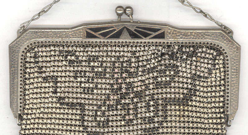 This is a really great purse that is probably one of Whiting & Davis' earliest models. I love it because of its HUGE size and the jeweled beaded handle on it. The purse is done in black and white tiles in a geometric diagonal design with a diamond in the lower center. Plus the fringe is super long and elegant. The silvertone frame (which does tarnish like sterling even though it is not marked as such) is engraved in a beautiful design on both sides. And the long chain handle has 8 jet 'jewel' beads accenting it for added charm. Now as to condition ... it is far from perfect but it is beautiful even with these imperfections. There are a few strands of the chainlink fringe missing ... if you wanted to replace these, it would be relative easy as they are just plain silver links. There is a fair amount of enamel loss on the tiles of the purse; however, being silver tiles underneath, it really blends in quite well with the color of the purse overall and is not even noticeable unless you look closely (I am including two close-up pictures but bear in mind that it looks pretty good in person and you would not think that it was not made this way). The only other apology is a bit of a gap under one of the hinges. Again, this could be fairly easily repaired but not with my poor vision. It's simply a matter of attaching a link or two to the frame. Please view all the close-up pictures and draw your own conclusions. I love this purse and have had it for quite a while simply because it is so unique. Measures 6" wide at the frame x almost 13 " long. First time offered! (Click on pic for more photos.) |