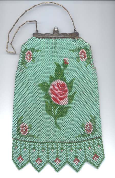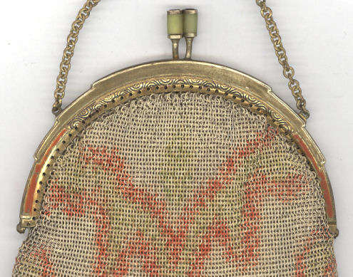 Here we have a pretty little Dresden mesh purse that was made in Germany. The clasp has two jade colored beads ... not sure what the material is -- could be plastic, bakelite or possibly real jade. Purse is done in tiny ring mesh with Van Dyke fringe. There is pale green and red/orange silk-screen designs on the mesh and the frame has traces of red/orange enameling. There is minor wear on this but the mesh is all intact and in great shape. Interior is lined and that is also in very good condition. Measures 4" wide at frame x 7" long to bottom of fringe. Previously listed for $250. (Click on pic for more photos.) |