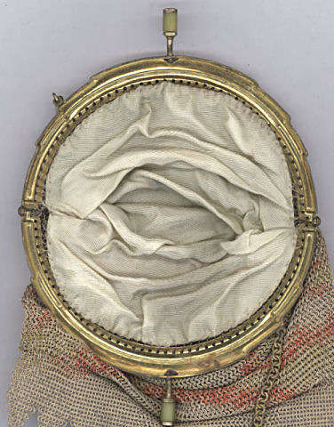 This rare large size Whiting & Davis dresden mesh purse is absolutely one of my very favorites ... I just love the soft pastel colors that resemble a fine impressionistic painting. The frame is stunning ... bright gold with beautiful embossed details including a fabulous high clasp surround for the pushbutton. The handle is a combination bar and ring and the bars are all intricately embossed as well. The back of the frame has the same design as the front. Interior is lined in pale gold silk which needs tacked down on one side about an inch on either side ... not a hard job. Overall, the entire purse is in impeccable condition with no damage or wear to the beautiful colors at all. The size is absolutely the biggest I have ever seen for a Dresden mesh ... it measures 5-1/2" wide at frame x almost 9-1/2" in length overall. At the very bottom, it measures 7" across. Note how the fringe hangs in a ruffled effect ... very pretty! Previously listed for $899. (Click on pic for more photos.) |