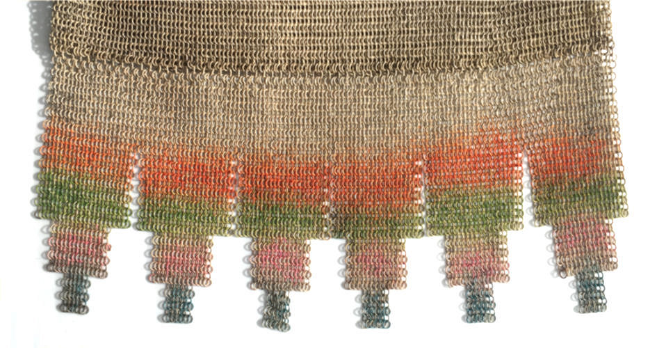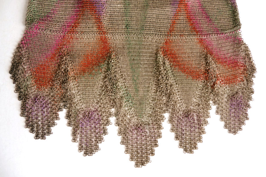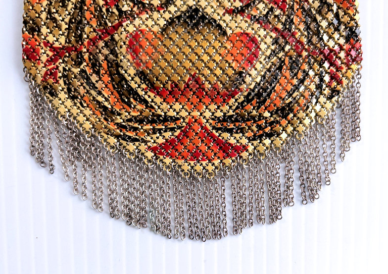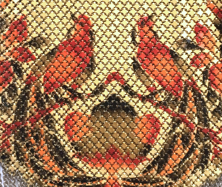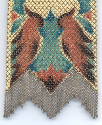 Very popular design by Mandalian featuring a pair of Birds of Paradise intertwined into the design. Lovely colors of coral, teal, and red on a creamy background. Entire purse is in excellent condition with no enamel loss that I can see. Only problem anywhere is a few tiny rings missing from the two end fringes (one on either side). This should be easy enough to replace. All links are tight to the frame as well. Measures 3-3/4" wide x 8" long overall. Previously listed for $599. (Click on pic for more photos.) |