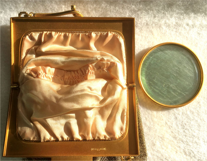 Very pretty floral design with smoky purple stripes along the sides. It is lined in yellow silk and has the original round beveled mirror. All in great condition ... nice art deco stepped frame which also has embossed stylized flowers. Measures 5" wide at hinges x 7" long overall. Previously listed for $550. (Click on pic for more photos.) |