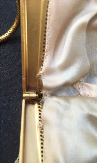 Another one of Mandalian's hard-to-find styles: the Gloria bracelet frame! This one is in lustro pearl finish with emerald green and coppery brown and black on a cream background. Diamond embossed designs surround the bracelet frame and clasp flips up to open the purse. Bracelet is a spring-band that pops open when the clasp is released. These purses are so hard to find that I bought it even with the missing chainlink fringes (as these are easily enough replaced). Enameling is in excellent conditon; a few links are detached on either side right at corners (see interior pic). Measures 4-1/4" wide x 8" long to tip of fringe. Previously listed for $950. (Click on pic for more photos.) |