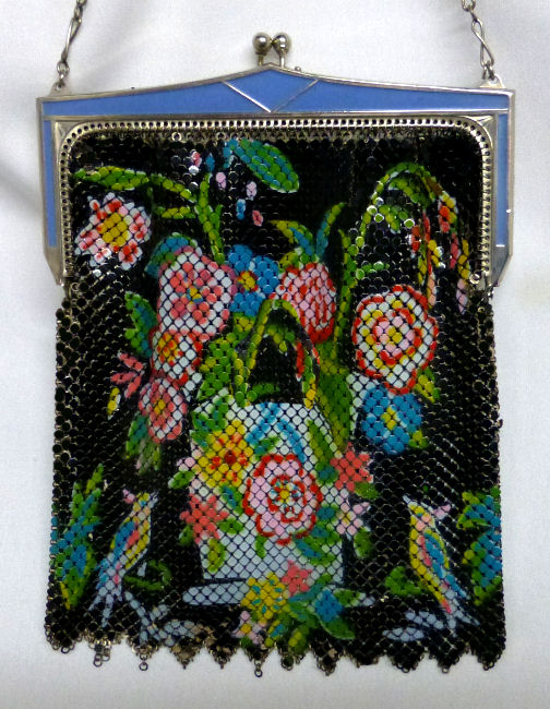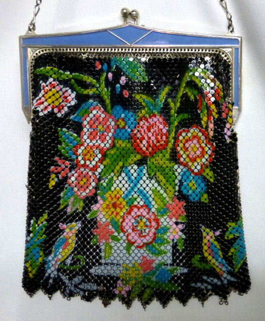 I just love this purse! It is a Whiting & Davis figural purse with two exotic birds in the lower corners on both sides. In the center is a vase overflowing with vibrantly colored flowers. The bottom of the purse appears to have had chain fringe at one time ... a previous owner probably removed them because some were missing. If someone wanted to redo this, it would not be that difficult but I have never felt the need to as the purse is so pretty as it is. There is some wear to the enamel scattered throughout, but due to all of the bright colors, it's really not noticeable. The blue enameled frame is in great condition on both front and back with no enamel loss at all. Mesh is gapping a bit at the armpits but not bad. Signed Whiting & Davis on the inner frame. This is a rare design that I have never had before nor seen elsewhere. It's a great piece! Measures 5 " wide x 7" long from clasp to fringe. First time offered! (Click on pic for more photos.) |