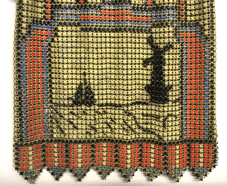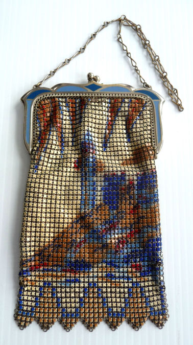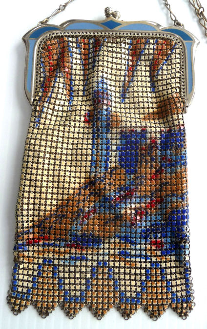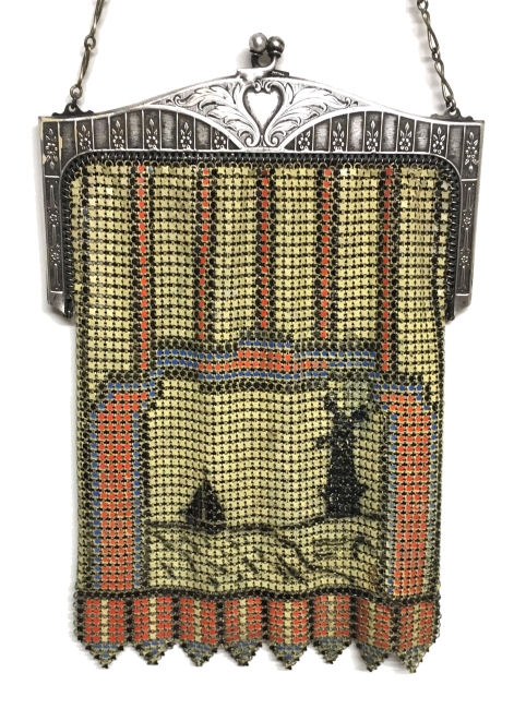 Here is a truly unique scenic Whiting & Davis mesh purse featuring strong art deco designs surrounding a panel on the lower half of a sailboat and windmill. The frame is beautiful embossed with a heart in the center and vertical stripes with tiny flowers. These stripes are carried on in the design of the purse which is interrupted for the scenic panel and then finished off in the VanDyke fringe. Both sides of the purse are identical so there is no front or back per se. Colors are a creamy background with black, coral, and blue accents. It is in excellent condition throughout. Original hangtag is inside as well. Nice large size measuring 5"" wide x 7-1/2" long from clasp to fringe tip. First time offered! (Click on pic for more photos.) |