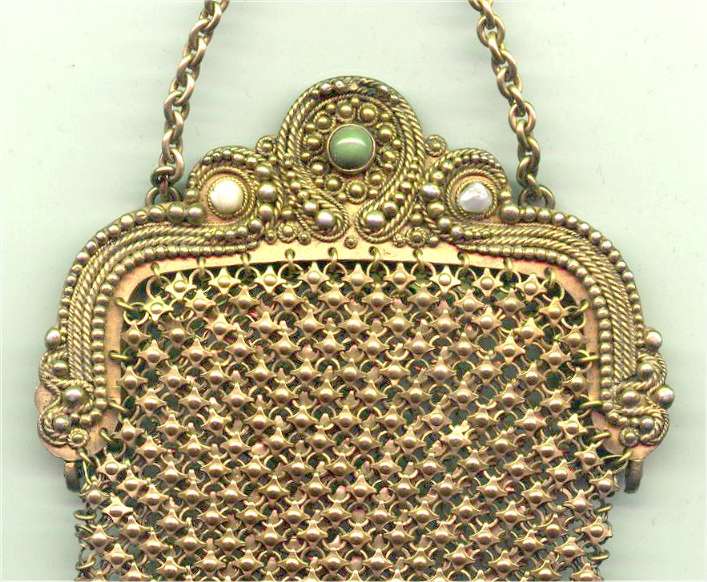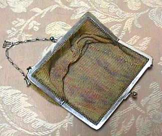 This is one of the prettiest Sunset mesh purses I have had. It resembles a Whiting & Davis style but this one was made in Germany. It has a saphire jeweled clasp and very prety embossed frame with pale green enameling. The body of the purse is done in gold, silver and bronze stripes ... thus the sunset name. Pretty gold link chain tops it off. Interior is lined in soft blue cotton in excellent condtion. In fact, the entire purse is in mint condition with not a bit of wear or color loss to the purse or any missing rings. The mesh is so finely done it feels like silk. Measures 4" wide at frame x 6" long. Previously listed for $499. (Click on pic for more photos.) |