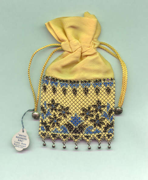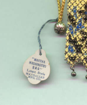 When they say "good things come in small packages," they must have had this little darling in mind! One of Mandalian's scarcest purses is this adorable little mesh purse with its original tag proclaiming it to be a "Martha Washington Bag, Latest Style, Mandalian Mfg. Co." Just large enough to hold a compact and some change, this little sweetie is yellow with blue and black trim, yellow silk top, and yellow drawstrings tipped with filigreed metal baubles. And the fringe consists of little Van Dyke triangles tipped with tiny silver beads. It is a delight to see and hold, and in unused, MINT condition! Where will you ever see another? Measures a miniscule 3-1/4" wide x 6" long. Previously listed for $799 .. now selling for below my cost! (Click on pic for more photos.) |