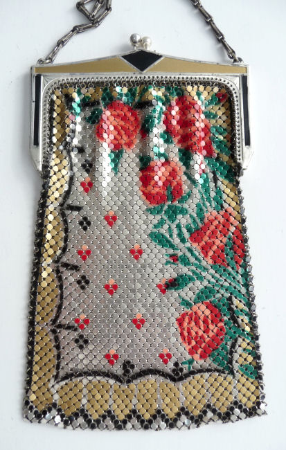 I'm not exactly sure how to refer to this purse so I am calling it a "metallic" finish ... the silver portion of the mesh purse is all done in highly polished silver tiles that sparkle and shine. The roses and gold portion are enameled in the usual manner which gives it a wonderful contrast to the polished tiles. The frame is finished in black and gold enamel to match the purse. It is quite a striking purse and one I have not seen another like. It is in excellent condition with no missing or loose tiles. It is unlined ... someone has engraved the name A.L.WADE on the inside of the frame so I guess that was a previous owner. The handle is a very interesting heavy chain which I have not seen on another purse either. This is just a totally unique and beautiful purse. Measures 4" wide at the frame x 7 " long. First time offered! (Click on pic for more photos.) |