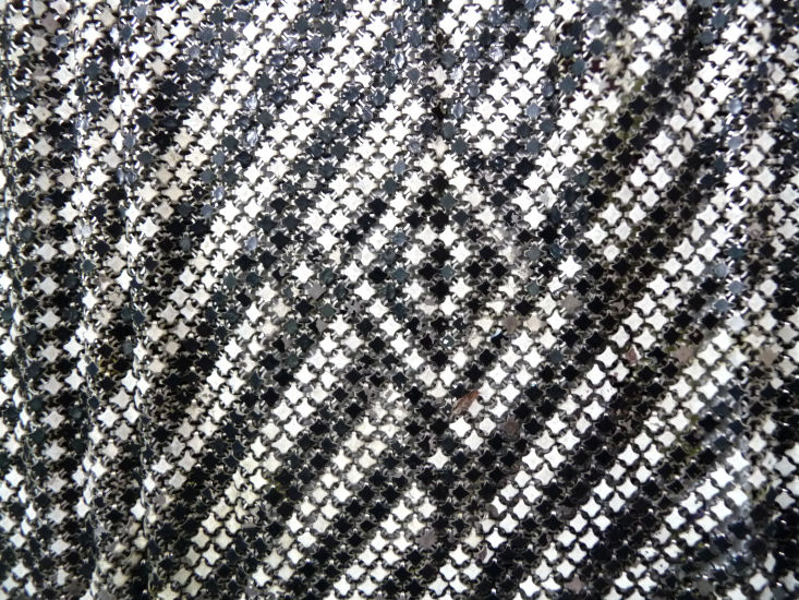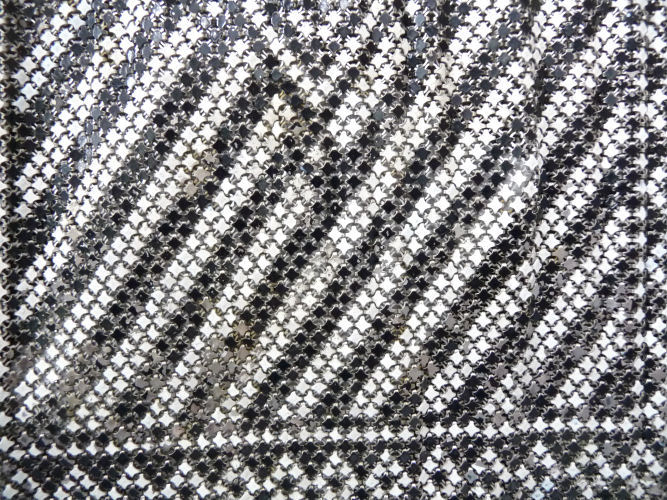 Here is a striking Whiting & Davis ring mesh purse in near mint condition. This is an earlier purse ... size is much smaller than their later purses. Very dramatic black deco swirling design on silvery background makes this purse stand out from the rest. The frame is a simple black on silver and is in perfect condition. In fact, the only flaw anywhere on this purse is three links that have come detached by one hinge. Measures 3-1/2" wide x 6-1/2" long. Elegant in its simplicity! Previously listed for $465 ... now offered at my cost. (Click on pic for more photos.) |