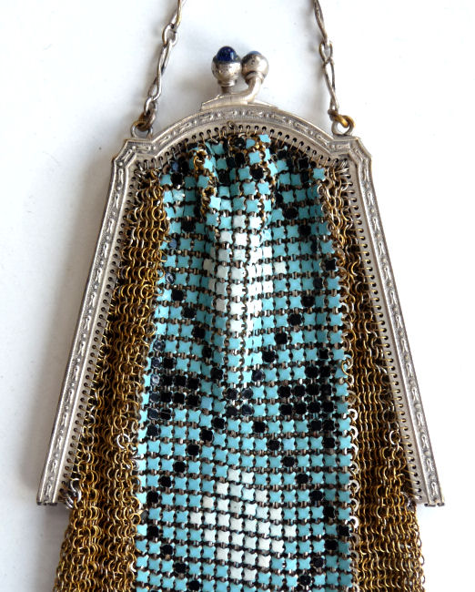 This gorgeous purse has been in my collection for several years now and I am reluctant to part with it but it is time. In I just love the style of this one ... it has a beautiful enameled mesh center panel which reaches from frame to the V shape bottom and either side is done in tiny ring mesh. Each side panel has ruffly ring mesh fringe which sets off the center section perfectly! The frame is not marked sterling; however it must have significant silver content as it does tarnish and polish like sterling. There are two sapphire jewels in the clasp. It is marked on the inside of the frame Whiting & Davis. This beautiful purse is in near perfect condition with all mesh intact and only a wee bit of wear to the enamel at the very bottom of the back side. Measures 2-7/8 " wide at hinge, 3-1/2" wide at bottom of fringe when hanging, and 8 " long from clasp to fringe. First time listed! (Click on pic for more photos.) |