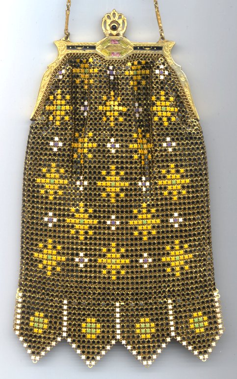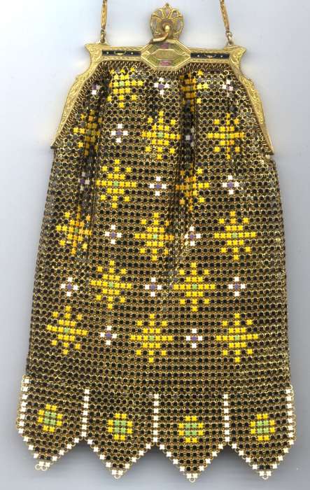 This is one of Whiting & Davis' finest Dresden mesh purses ... at least in my humble opinion. The frame on this purse is just stunning with it's rich enameled colors and marcasites inlaid all around. And the bonus is that both sides are the same! This particular purse features a yellow vase of flowers in abstract fashion and large flowers cascading from it. Bar and link chain has enameled decoration which does show some loss. The enameling on the frame is very nearly perfect with only one very small chip on the upper right corner on the "back" side. There are a total of four tiny marcasites missing but these are almost impossible to notice. Interior is lined beige silk in perfect condition with tiny smocked pocket. Needs to be retacked to the corners by the hinge, otherwise perfect. And the price is a bargain ... I have sold these for as high as $799 in the past. Measures approximately 5-1/4" wide x 9" long to bottom of fringe. Previously listed for $399. (Click on pic for more photos.) |