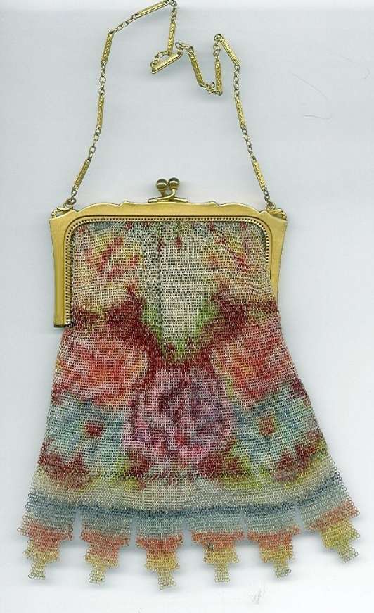 This wonderful Whiting & Davis Dresden mesh purse has one of my favorite types of fringe: the stepped version which is matched by the stepped clasp. This is a fine example of deco styling and dates the purse to the 20's or early 30's. Look at the lovely watercolor roses on the front and the purple flower down in the lower corner. All of these colors kind of 'melt' down into the fringe giving it a rainbow effect. The interior is lined in cream silk with the original round beveled mirror. The silk has pulled away from the frame near the hinges and has a few splits, but overall is in very good condition. Original W & D hang tag can be found inside. Mesh is in excellent condition and is all tight to the frame ... there is very minor color loss here and there but the pictures very accurately show the condition of the purse. Measures 4" wide x 7" long from clasp to tip of fringe. Previously listed for $499. (Click on pic for more photos.) |